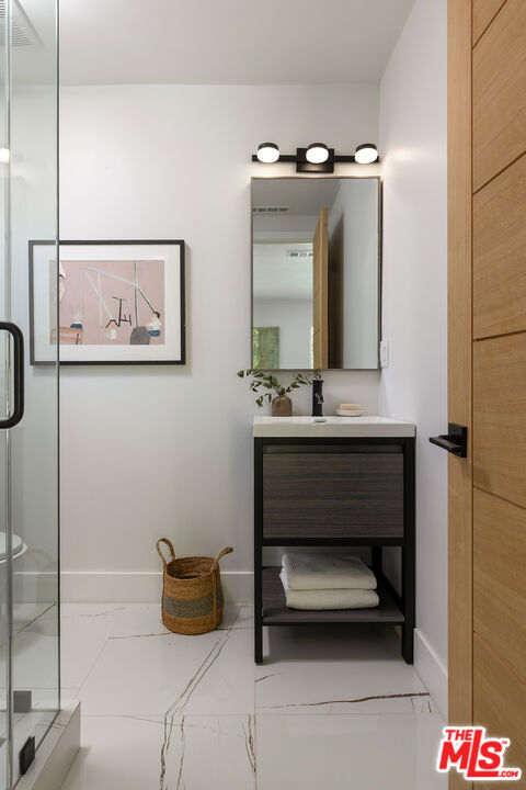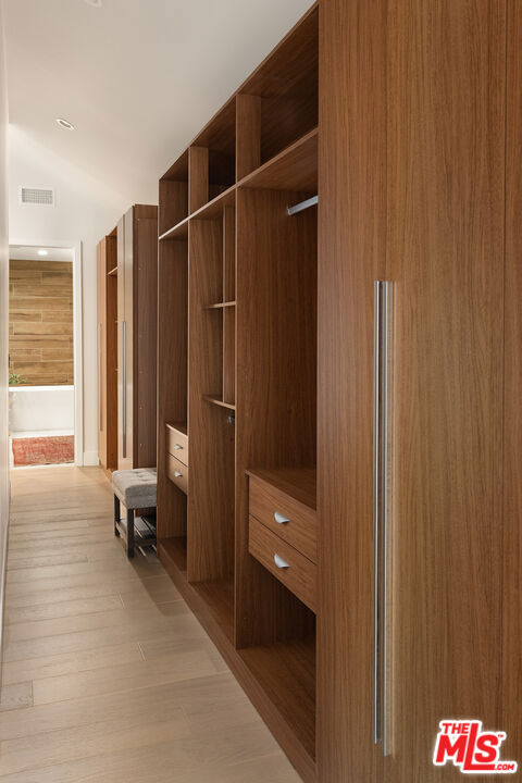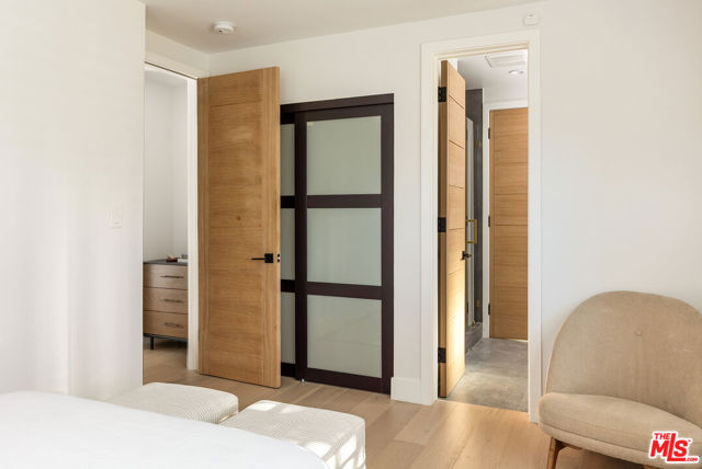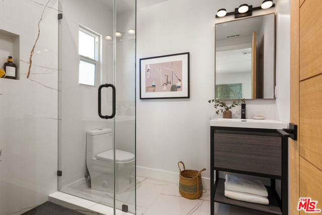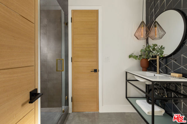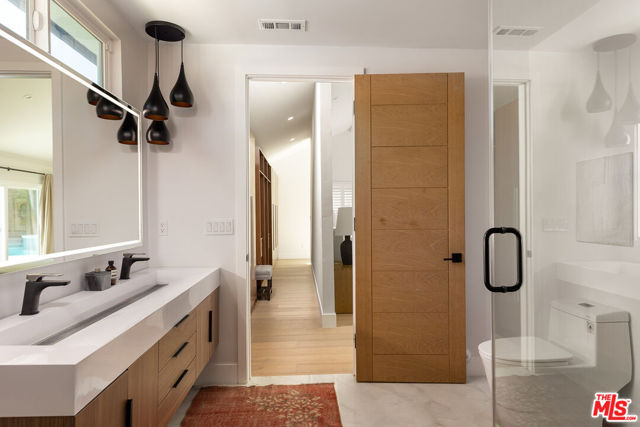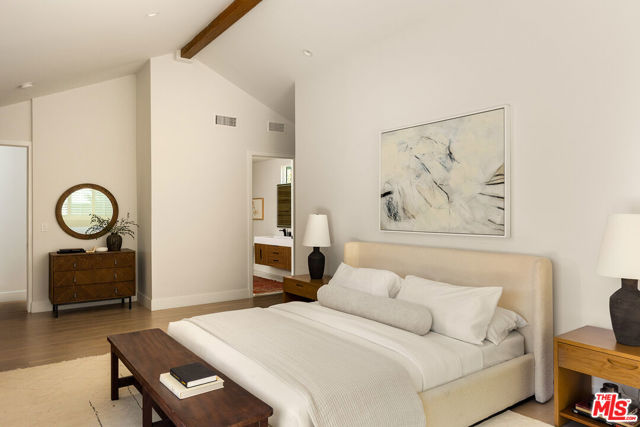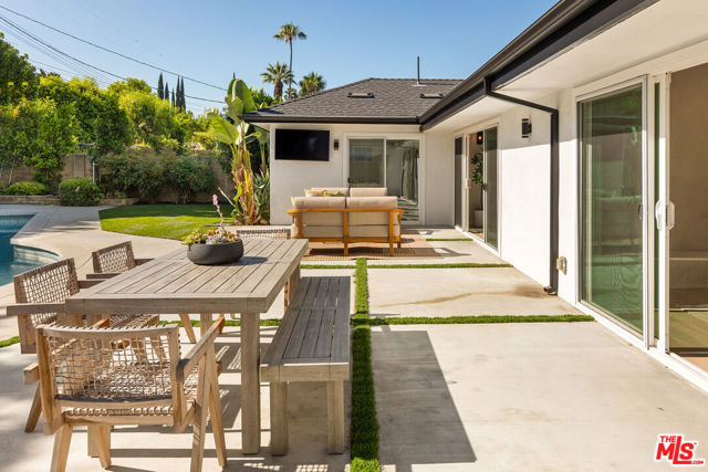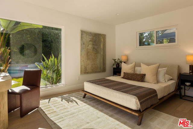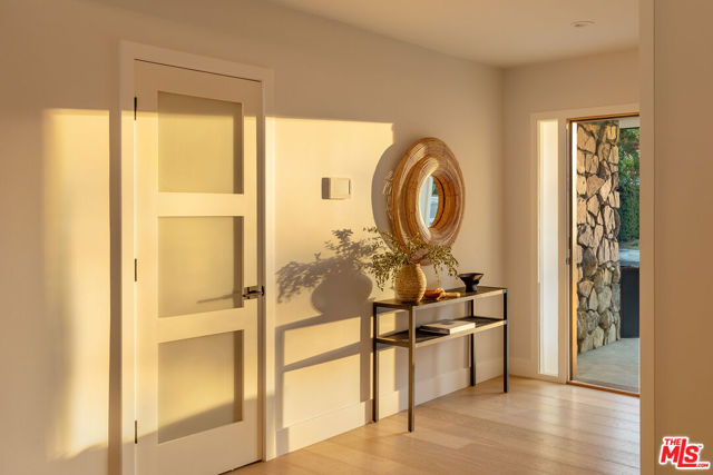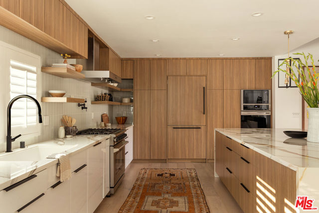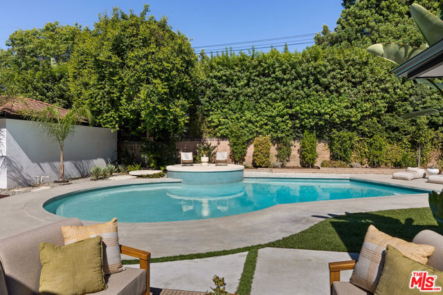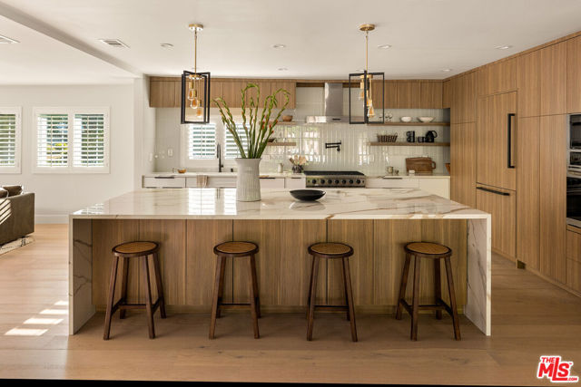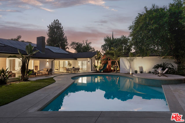 Just Reduced! Stunning Mid-Century Charles DuBois Architectural with Pool in Prime Woodland Hills. Located on a desirable corner lot in one of the most sought-after areas of Woodland Hills, this impeccably remodeled Mid-Century Charles DuBois home offers over 3,000 sq ft of thoughtfully designed living space with 4 bedrooms and 3.5 bathrooms. Step through a custom oversized front door into a sun-drenched, open-concept interior featuring soaring ceilings with exposed beams, wide-plank white oak floors, and a dramatic Venetian plaster double-sided fireplace separating the formal living and dining areas. The chef’s kitchen is a showpiece designed for both entertaining and everyday living. Highlights include a striking waterfall island, sleek wood and glossy white cabinetry, gold vein Calacatta countertops, and top-tier appliances including a panel-covered Fisher & Paykel fridge, Miele dishwasher, Frigidaire double oven, and Thor gas range. No detail was overlooked in this one-of-a-kind renovation: designer light fixtures, floating vanities, custom accent walls, solid extra-tall wood doors, and premium tile and finish selections throughout. The luxurious primary suite features cathedral ceilings with a central beam, a spa-like bath with a freestanding tub, floating double vanity, oversized walk-in shower, and a massive custom walk-in closet. Additional highlights include a spacious laundry room and pantry with smart controls, and a separate en-suite bedroom located on the opposite wing of the home ideal for guests or multigenerational living. Step outside to a private resort-like entertainer’s backyard with newly designed hardscape, lush modern landscaping, and a large sparkling pool. Major upgrades include newer roof, dual HVAC systems, updated electrical panel, tankless water heater, recessed lighting, CAT wiring, plumbing, and all new pool equipment, plaster, tile, and coping. A detached garage with a private side entrance offers excellent ADU potential. Ideally located near top-rated charter schools, Bristol Farms, Calabasas Commons, Topanga Village, and the beloved local Farmer’s Market, with quick access to the 101 freeway. The best value in Woodland Hills based on quality remodel, lot size, privacy and location.