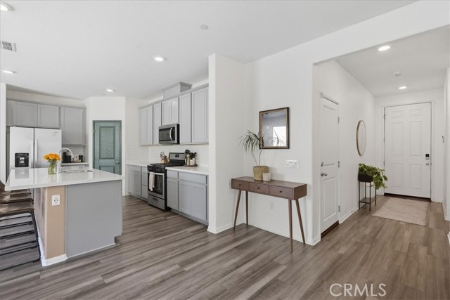 First Time on the Market!rnrnWelcome HOME to this STUNNING 4-Bedroom, 3-Full Bathroom, Two-Story home located in the Highly Desirable Summerly Community!rnrnThis home boasts a modern transitional design, featuring an open-concept kitchen with sleek gray cabinetry, quartz countertops, white subway tile backsplash, and stainless steel appliances. Luxury vinyl plank flooring flows seamlessly into the bright and airy living and dining spaces, creating the perfect balance of style and comfort. Neutral tones paired with natural light make the home feel warm, inviting, and move-in ready.rnrnFeatures You’ll Love:rn• Upgraded Throughout – Quartz countertops, luxury vinyl plank flooring, and plush carpet in bedrooms, stairs, upstairs hallway and epoxy-coated garage flooring.rn• Functional Floor Plan – Open concept kitchen and living area, perfect for entertaining. Plus, a bedroom and full bath downstairs for guests or multi-generational living.rn• Garage: The two-car garage features a durable epoxy-coated floor, offering a sleek look that is easy to clean and built to withstand daily use. Perfect for parking, storage, or a home gym. There is also a Tankless water-heater and Pre-wire for an electric vehicle charger.rn• Entertainer’s Backyard – Concrete patio and lush green lawn, ready for BBQs, family gatherings, and outdoor fun.rn• Energy Efficient – This home comes with solar, helping you save on energy costs while living sustainably.rn• Move-In Ready – Stainless steel kitchen appliances, refrigerator, washer, and dryer all stay with the home!rnrnThe Summerly Lifestyle:rnLive where every day feels like a vacation! Summerly offers:rn• 3 sparkling pools + relaxing sparn• Splash padrn• Modern clubhousern• 3 beautifully maintained parksrn• Basketball courtrn• Exciting year-round community eventsrnAll with a low HOA of just $122/month!rnrnDon’t miss this opportunity to own a home in one of Lake Elsinore’s most vibrant communities. Schedule your private showing today!
