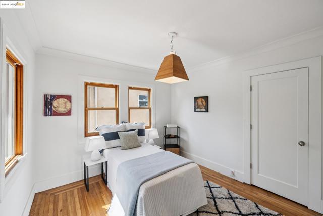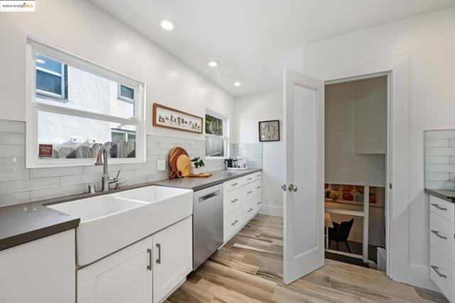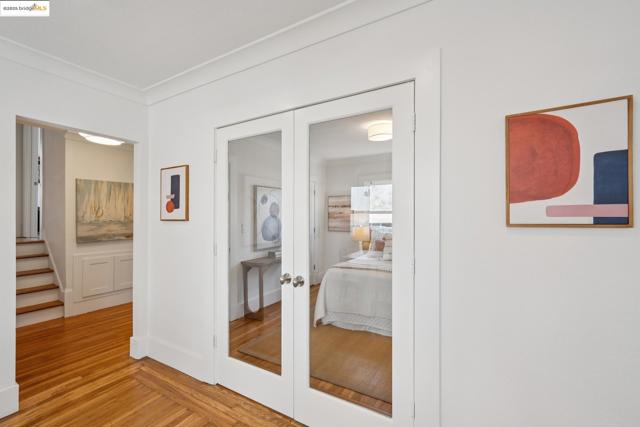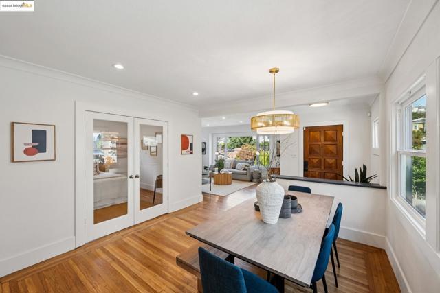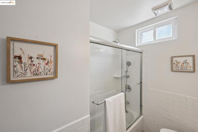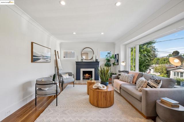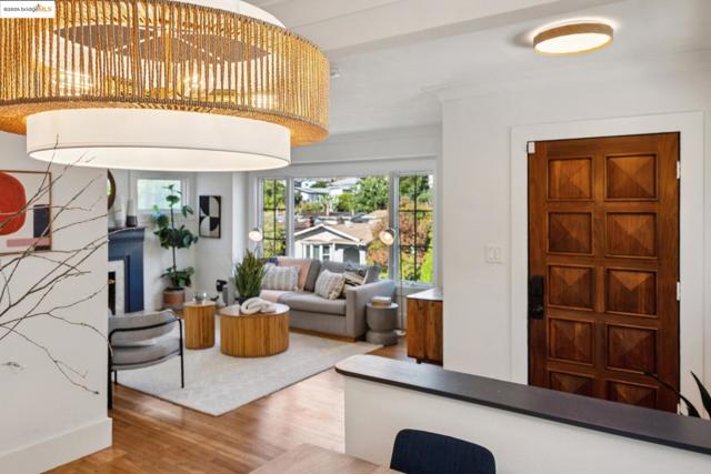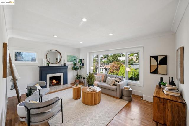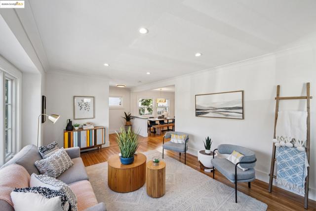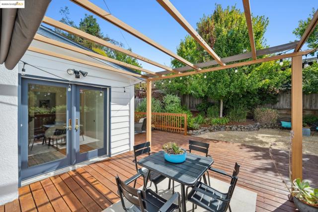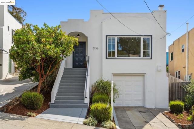 Nestled among the serenity of Oakland’s Maxwell Park neighborhood, you’ll find a charming, updated, split-level c.1925 home at 3136 Kingsland Avenue. Three bedrooms and 1.5 bathrooms grace this home. Add to that a sunny, updated kitchen, opening to a dining and living room, with brick fireplace and a front window overlooking the neighborhood. Hardwood floors glow throughout the home, while dual-pane windows add to the peacefulness within. Both renovated bathrooms feature cheerful tile work. A laundry room is tucked away on the ‘mezzanine’ level off the kitchen, opening to the side year, while another bedroom and the primary bedroom suite are located a few steps up, with French doors to the back deck. The backyard oasis features a redwood deck shaded by a pergola with retractable awning, with loads of space for hosting family gatherings and guests… or peaceful moments of morning coffee and yoga, or evening meals. Step from that into an urban garden, with mature fruit trees and raised bed gardens. So unexpected, and lovely for indoor/outdoor entertaining! A one-car garage with loads of storage completes the picture. Move-in ready and minutes away local shops, restaurants, parks, theaters, art galleries and convenient access to 580, 13, and public transportation. Home sweet home!