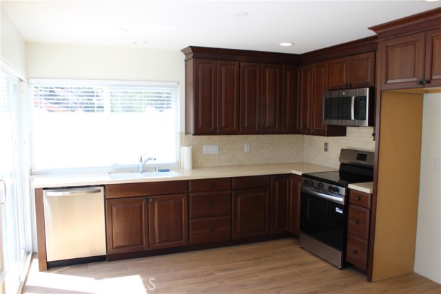 Very nice large family home, with four bedrooms (one bedroom downstairs) and 1/2 bath downstairs, three bedrooms upstairs, master is huge with large retreat area and fireplace. This home has a newer upgraded kitchen with newer custom dark brown cabinets, newer appliances, newer quartz counters, brand new flooring downstairs, brand new carpet throughout upstairs. Bathrooms have new cabinets and faucets, new bath tub in upstairs bathroom. Newly painted, scraped ceilings, leaded glass entry doors, newly seeded lawn and a huge dog run area on side which is gated. Awesome back yard seems like a park, newer fence and gates, 3 car garage newly painted, newer roll up garage doors and side gates, opener on two car garage. Located on small cul-de-sac street, near shopping and schools you kids can walk to schools if they want. Family room which is off the kitchen also has a fireplace perfect for those cold nights. A must to see this home!