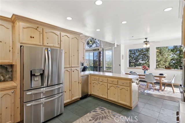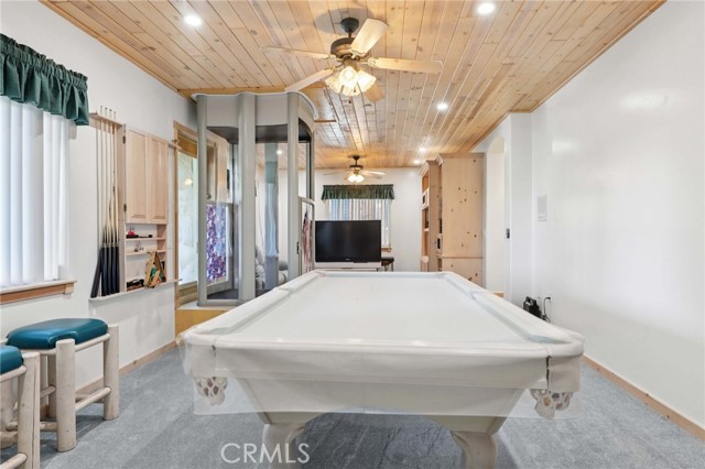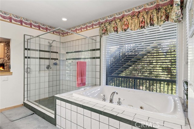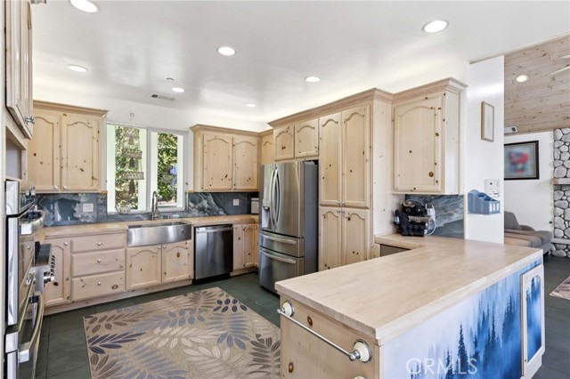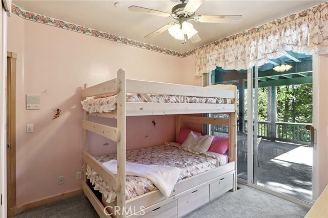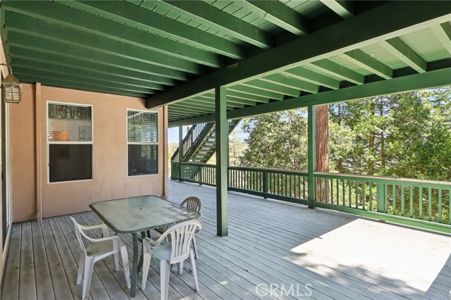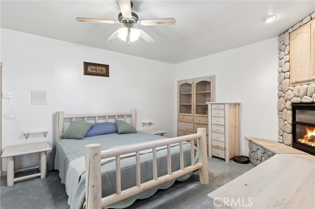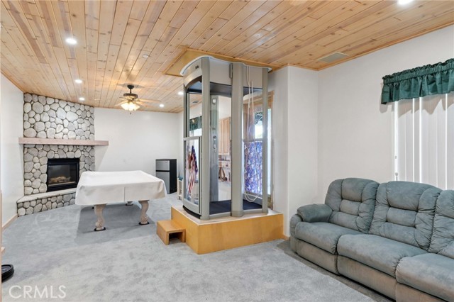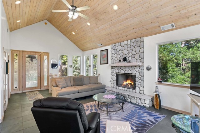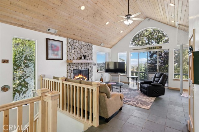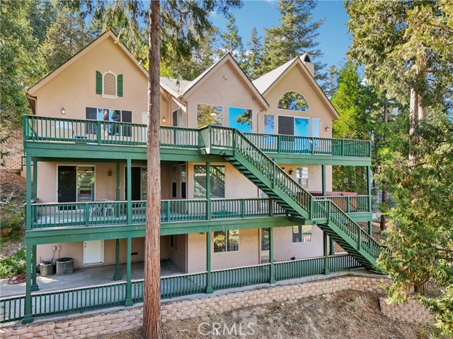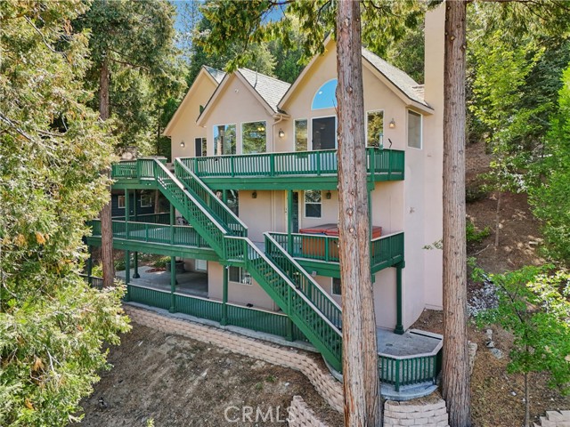 Truly gorgeous 3 level home featuring 5 bedrooms and 3.5 bathrooms with Lake Rights, is ready to be made yours! Enter through a custom glass door with bear/nature design into this spacious home on the top floor with beautiful wood panel cathedral ceilings offering recessed lights, stone flooring, a floor to ceiling stacked stone fireplace and a wall of windows showcasing beautiful forest views! The living room flows into the dining area and recently remodeled kitchen with wood cabinetry offering plenty of storage space, a kitchen island forest mural plus stainless steel appliances. Both the dining area and the living room have sliding glass doors that open to the huge Trex deck with built in BBQ located on the top floor – this is the perfect space for relaxing and entertaining guests! All of the bedrooms are located downstairs on the 2nd floor including the massive primary suite with a fireplace a large walk-in closet, and a spa-like ensuite with soaking tub, separate shower, and dual sinks. There is also a hall bathroom for the 4 secondary bedrooms to share, a large laundry room, and a covered Trex deck with included Spa! Down on the 1st floor you will be able to enjoy a large game room/family which also features a fireplace and a 3rd Trex deck to enjoy! This home also features dual generators, dual HVAC systems, and attached 2-Car, extra deep, Garage and driveway parking for 2! The home is also ADA accessible! Also located not far from the lake and many outdoor activities to enjoy! The access road is serviced by the County. Schedule an appointment and come tour today!