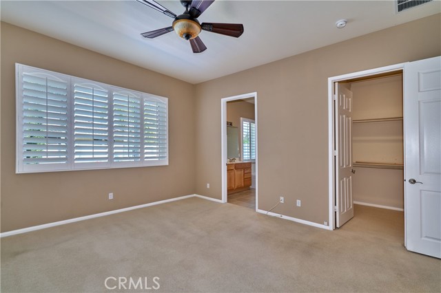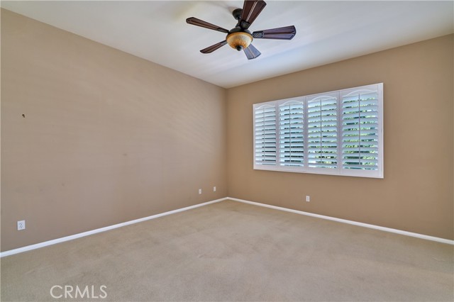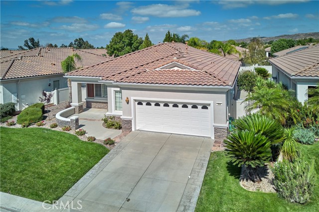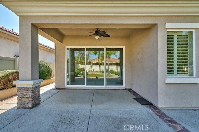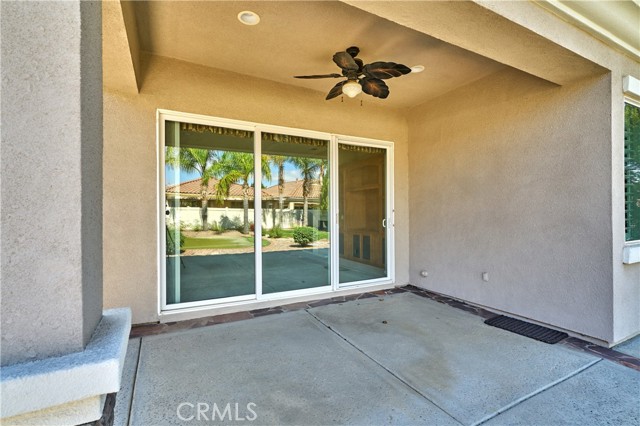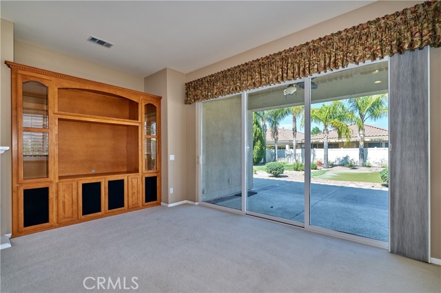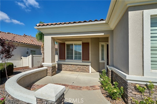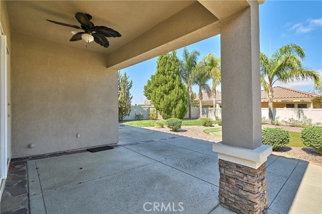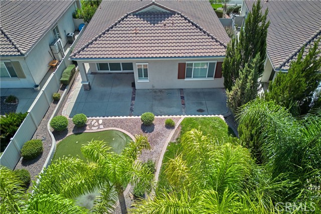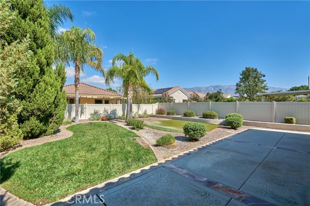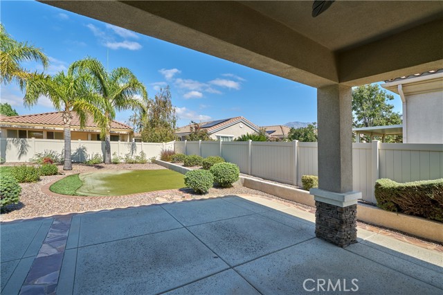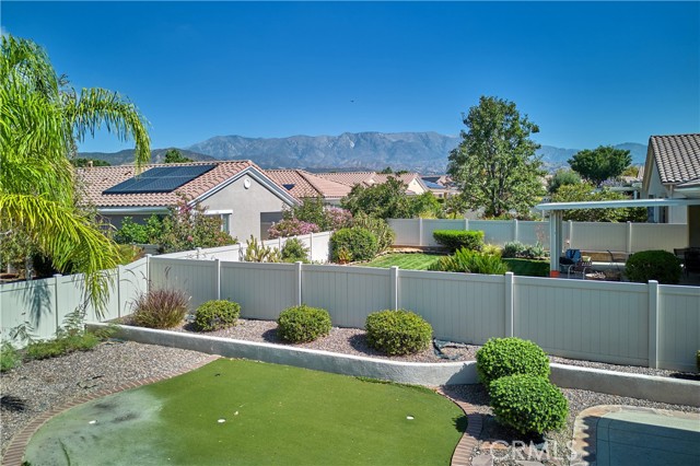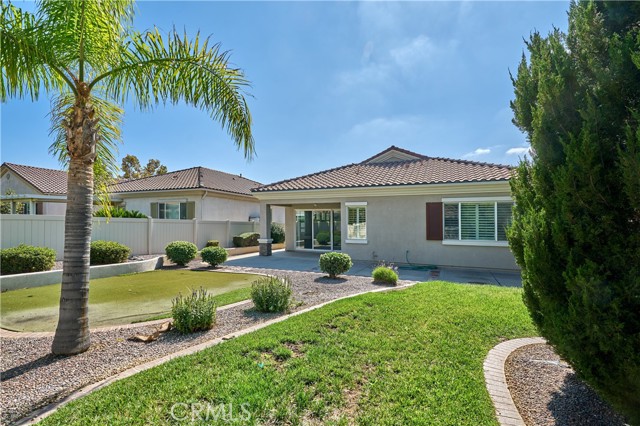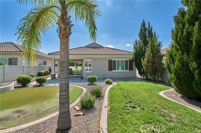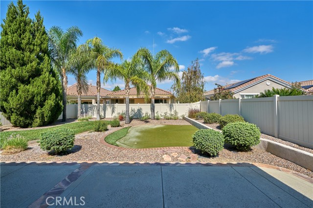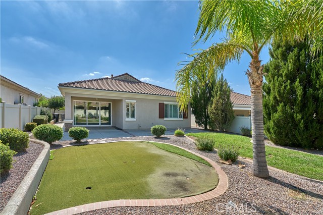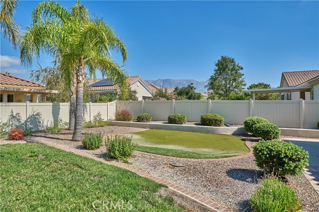 Pristine Trillion model in the gated 55+ community of Solera. The outdoor spaces are a true highlight—exquisitely landscaped front and back yards with palm trees, a putting green, and extended patios. The kitchen showcases granite countertops and ample cabinetry, flowing into a spacious living room with a cozy gas fireplace. A den/office includes a built-in desk and extra recessed lighting. Plantation shutters add a clean, finished touch. The primary suite offers a walk-in shower, soaking tub, and a generous walk-in closet. Plenty of extra storage cabinets in the garage. As a Solera resident, you’ll enjoy resort-style amenities including a clubhouse with library, banquet facilities, billiards, fitness center, pool, spa, bocce ball, and tennis courts. There are also many clubs to join and organized trips. Spectrum internet and basic cable are included. Solera offers easy access to Redlands, Cabazon Outlets, the best golf courses and short drive to Palm Springs. There’s no place like your new home!