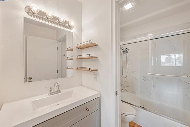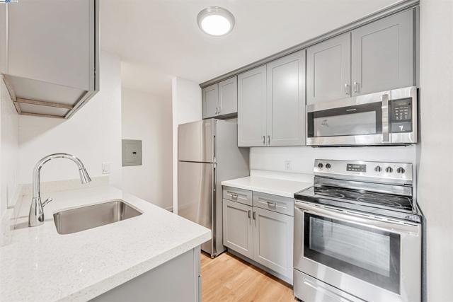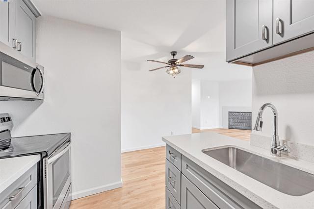 Welcome to this move-in ready, top floor end unit condo with freshly painted interiors and sleek laminate flooring throughout. The updated kitchen showcases quartz counters, stainless steel appliances, and custom cabinetry with plenty of storage. Both bedrooms offer generous sized closets, while the remodeled bathrooms feature custom vanities and beautifully tiled showers. Step onto your private balcony to enjoy peaceful foothill views perfect for morning coffee or evening unwinding. This property is a commuter’s dream walking distance to South Hayward BART and just minutes from 880, San Mateo Bridge, Silicon Valley shuttle stops, hiking trails, shopping centers, and beloved local eateries. Located in a secure gated community with assigned parking, this home is the perfect blend of comfort, style, and low maintenance living.