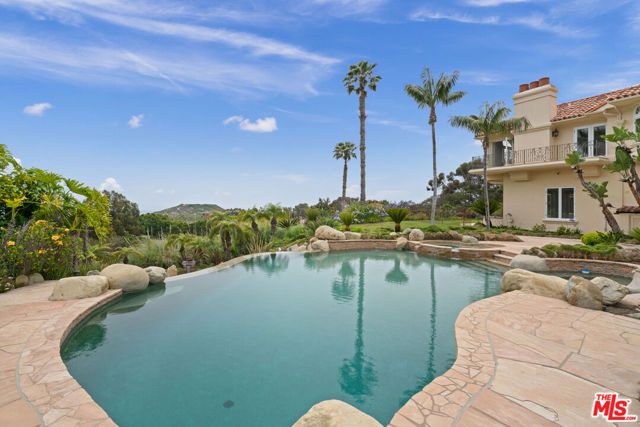 This Idyllic Mediterranean Estate on 2+ Acres at the heart of Point Dume with 180* Promontory Ocean and Point views combines traditional sophistication, warmth, and timeless European design in a private and peaceful So Cal setting. World class amenities include Gated Entry, Resort Lagoon pool with hot tub & water feature, tennis/sport court w/ equipment room, pool house w/outdoor kitchen, dining, bar, living area w/ fireplace, gated motor court with multiple parking spaces & guest parking, detached one bedroom guest house, and a wine cellar. This offering includes a 74,512 Sq Ft. main lot + an additional smaller 14,348 Sq. Ft. lot that connect to each other at the lower sports field where kids have the freedom to run and play or to accommodate larger events. At approximately 10,000 Sq Ft. the main residence features Public Rooms on the first floor and Private Family living on the second floor. Access the second level from one of two staircases to find an incredible Primary Suite featuring Coastline, Ocean, and Horizon Views, bath with steam shower, jetted tub, dual sinks and water closets, and dressing room. Completing this level are 3 additional bedroom suites with full ensuite bathrooms, a dance/yoga studio, and an executive office. On the first floor, rooms are expansive and the floor plan is thoughtfully positioned against the views and usefulness of spaces. The Great Room faces the Pool and a children’s play area, and its features include eat-in dining, wet bar, wood burning fireplace, and breathtaking Point Dume & Ocean Views. At the heart of the home is a Gourmet Kitchen with breakfast nook and counter dining, full suite appliances, dual refrigerators, custom Scandinavian cabinets, and pantry and service areas both of which are nearby the formal and casual dining. Completing the lower level is an entertainment room with pool table and fireplace as well as full Maid’s Quarters w/ ensuite bath & service entrance. This seasoned home is strategically positioned to take full advantage of Malibu’s impressive Sunsets and coastal breezes. Move right in and enjoy, or take advantage of the current size of the home and its’ layout to cosmetically update and personalize to make it your own. Text agent for a quick reply.