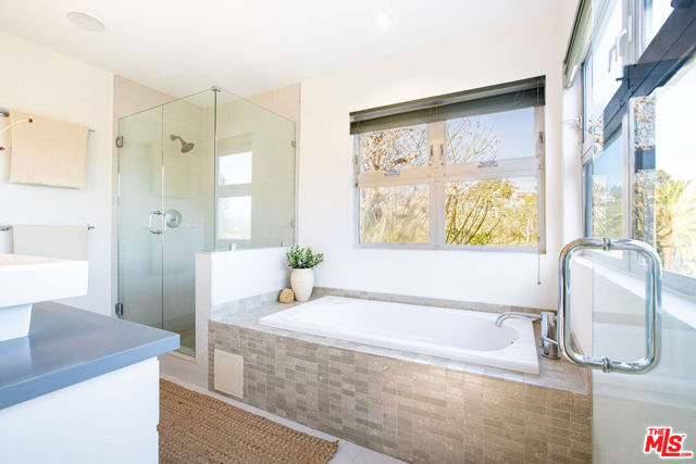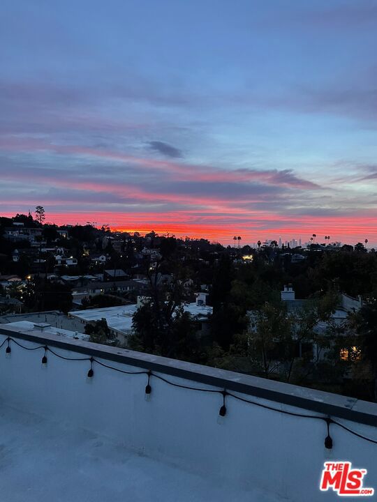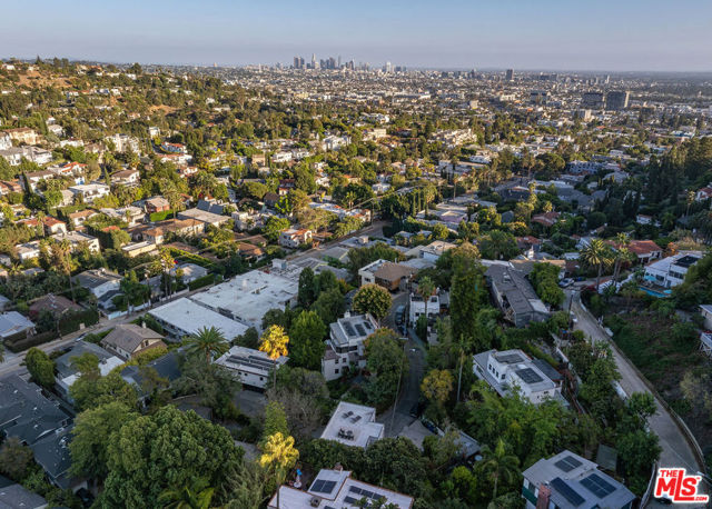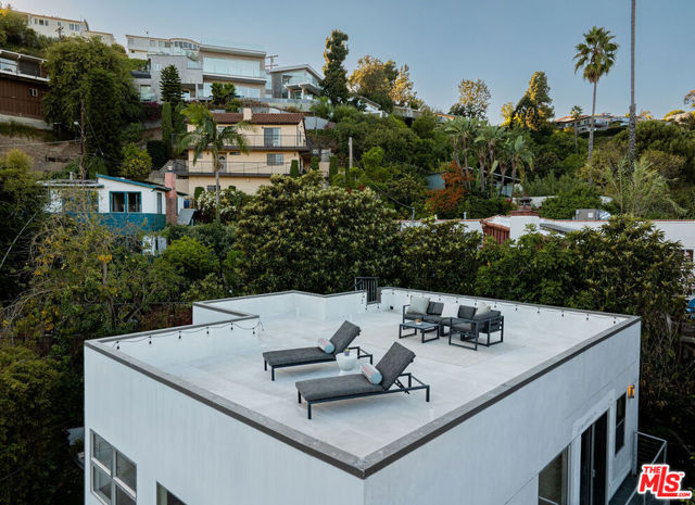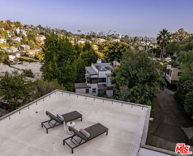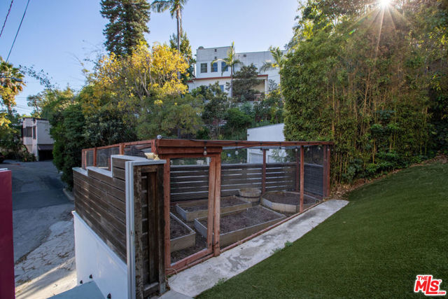 Discover a private canyon retreat that balances modern comfort with hillside character, just over half a mile up Beachwood Dr. Originally a 1925 cottage, this property was taken down to the studs and rebuilt into a light-filled modern 4-bedroom, 3-bath, 2-story home. Walls of picture windows surround the home, creating a treehouse-like atmosphere with natural light and 360 canyon views. Multiple outdoor spaces include a newly built 250 sq ft patio and a rooftop viewing deck showcasing stunning sunrises over downtown LA. Surrounding the patio, an enclosed organic vegetable garden and landscaped slope provide a lush green backdrop, creating a serene hideaway for outdoor dining and relaxation. Inside, soaring ceilings with exposed beams, wood floors, and a dramatic stacked-stone fireplace set the stage. The kitchen is equipped with Fisher & Paykel appliances including a dual refrigerator/freezer. A versatile bedroom with an adjoining bathroom, ideal for guests or a home office completes the main level. Upstairs, the primary suite and two additional bedrooms each have access to their own private balconies. The rare 2-car garage makes hillside living effortless. Whether entertaining, working from home, or unwinding above the city, this Beachwood Canyon residence offers the best of Hollywood Hills living.