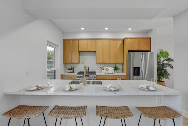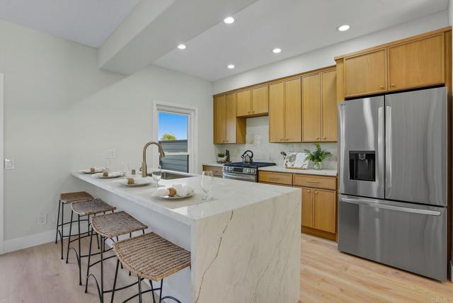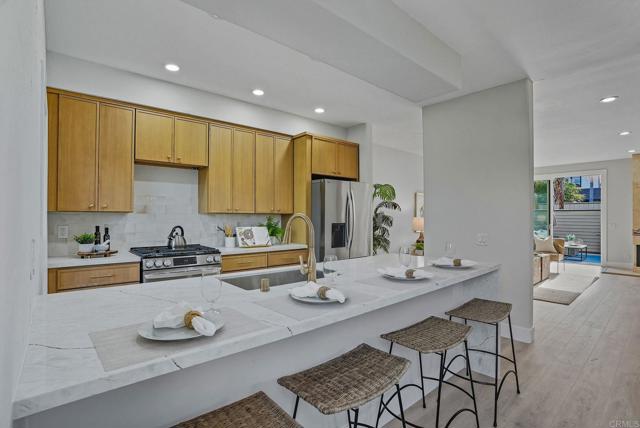 Live the coastal lifestyle just one block from Grandview Beach in this updated 2 bed, 2 bath, 1,528 sq ft townhome located west of Hwy 101 in Leucadia. Set within an intimate 6-residence community, the home offers soaring ceilings, abundant natural light, and multiple skylights, sliders, and windows for bright, airy beach living. The remodeled kitchen and updated bathrooms showcase modern finishes and vaulted ceilings, while dual primary suites each open to private balconies for indoor-outdoor flow. An exclusive front patio, three balconies, inside laundry, bonus storage/utility room, and a two-car garage add convenience. Walk to local cafés, shops, and restaurants while enjoying low-maintenance living in one of Encinitas’ most coveted coastal neighborhoods.