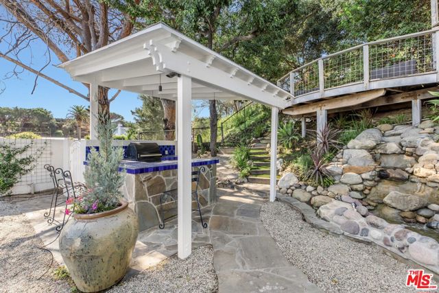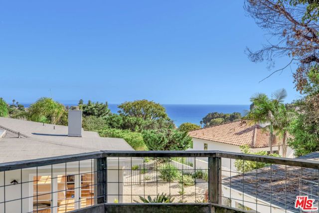 Nestled within the exclusive and thriving coastal enclave of Pacific View Estates, this sprawling single-level architectural home offers the rare combination of ocean views, modern comfort, and resort-style living on more than 20,000 square feet of private grounds. Located just moments from the beach and the Getty Villa, the residence is ideally positioned to take advantage of the serene coastal setting while remaining close to Palisades Village, Malibu, and the Westside. A dramatic skylit entry welcomes you into light-filled interiors where hardwood floors, vaulted ceilings, and French doors create a sense of scale and warmth. The expansive living room is anchored by a striking fireplace and opens seamlessly to outdoor entertaining areas, while the formal dining room is designed for gatherings both intimate and grand. The gourmet kitchen is a showpiece of form and function, featuring granite countertops, a center island, breakfast bay window, and an array of premium appliances: a Thermador range, GE Monogram refrigerator, GE microwave, Moen fixtures, and a Marvel wine fridge for curated storage. Skylights above flood the space with natural light, elevating both everyday meals and large-scale entertaining. The primary suite is a true retreat, complete with a sitting area, fireplace, dual walk-in closets, and a luxurious marble spa bath with dual sinks, a soaking tub, skylight, and glass shower. Additional bathrooms are appointed with Kohler fixtures and include an Axent.One C Plus intelligent toilet with full smart functionality. Secondary bedrooms offer versatility for guests, family, or office use, while a separate maid’s or guest quarters adds privacy and convenience. Step outside to a backyard designed for leisure and entertainment. Multiple patios and decks frame a dramatic waterfall pool and spa, complemented by a built-in BBQ center, lush landscaping, and expansive lounge areas perfect for soaking in sunsets and coastal breezes. The generous lot size allows for both privacy and play, creating the feel of a personal resort. With its one-story design, high-end appointments, and seamless indoor-outdoor flow, this residence captures the essence of California living. Combining location, luxury, and lifestyle, it is an exceptional opportunity in one of the Westside’s most desirable neighborhoods.