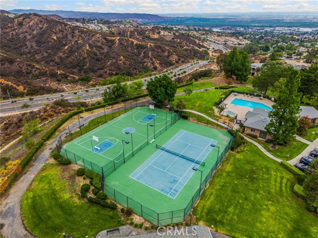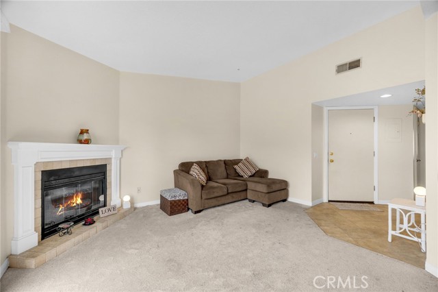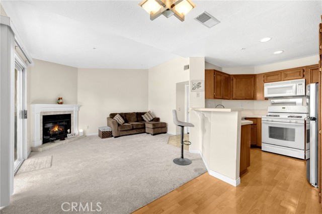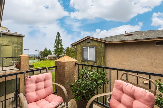 Uncover your dream home in this beautifully remodeled, turnkey top-floor condo in the gated Crowne Villas community, perfectly nestled above the serene, picturesque hills of Corona near Green River (Ontario and Avenida del Vista). This bright, open-concept one-bedroom, one-bath upstairs unit exudes warmth and charm, featuring a cozy, remodeled fireplace, newer carpet, paint, blinds, and a stylishly updated bathroom with new fixtures and tile. The open kitchen flows into a breakfast/dining area and connects to a private patio, ideal for relaxing and enjoying breathtaking panoramic views of the lush, mountainous 12-acre community. Equipped with modern conveniences, the unit includes a dishwasher, stove, microwave, fridge, and stackable washer/dryer. Ample storage enhances everyday living, while the serene, quiet setting is perfect for professionals seeking peace after a busy day. Community amenities elevate your lifestyle with a clubhouse, sparkling pool, spa, gym, tennis and volleyball courts, a dog park, scenic walking paths, and inviting benches to soak in the stunning hillside views. This upstairs unit in a two-story building offers a carport parking spot and ample open parking for guests. Located close to shopping centers, schools, and parks, this condo offers resort-style living in a tranquil, gated community.