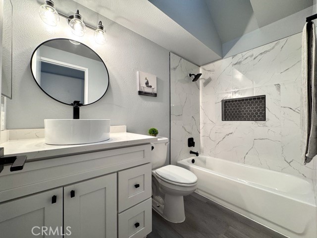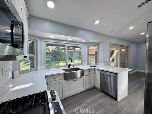 Welcome to this stunning single story home in Rainbow Canyon, nestled in the heart of Temecula! This beautifully maintained home features 4 spacious bedrooms and 2 upgraded bathrooms, and truly shows like a model home. Enter inside to find upgraded plank flooring, a neutral paint scheme, and a thoughtful layout with modern touches throughout. The inviting living room boasts a cozy fireplace and large windows that let in plenty of natural light. The adjacent kitchen overlooks the backyard and dining area, and features quartz countertops, a deep sink, stainless steel appliances (including a refrigerator), and ample cabinetry for extra storage. Down the hallway, you’ll find all bedrooms, both bathrooms, and the laundry room. Each bedroom is generously sized. The hall bathroom includes a shower/tub combo, while the primary suite is a true retreat, featuring two oversized closets, a sliding door leading to the backyard, and an ensuite bathroom with dual sinks and a spa like walk-in shower. The backyard is beautiful with two covered patio areas, lush green grass, and mature trees providing privacy. Don’t miss your opportunity to rent this beautiful, move-in-ready home in one of Temecula’s most desirable communities!