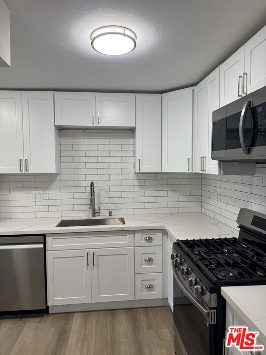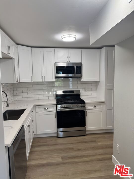 Completely remodeled end unit condo in a peaceful pocket of Van Nuys. This 2 bedroom 1 3/4 bathroom unit offers plenty of natural light and has new luxury vinyl flooring, new paint, new windows, new bathrooms and kitchen. Lots of storage space inside unit. Ample size balcony. New HVAC system. Two underground parking space. Unit located at the end of building facing Ranchito Ave and located on the quieter side of Sherman Way. Conveniently located walking distance to grocery stores, shopping centers and restaurants.