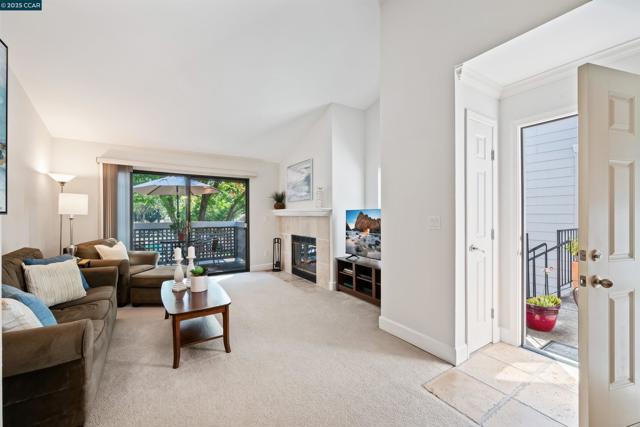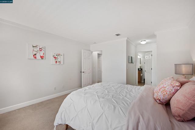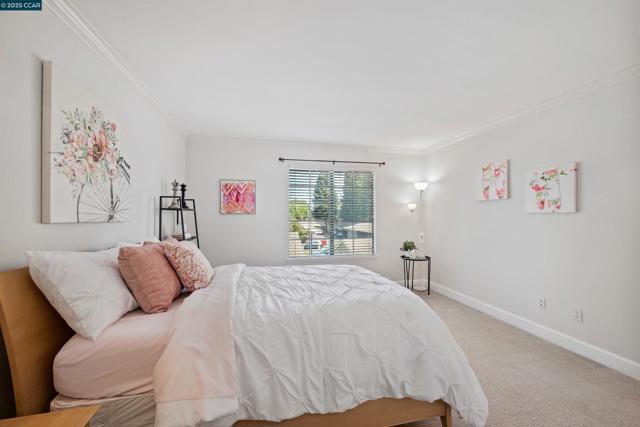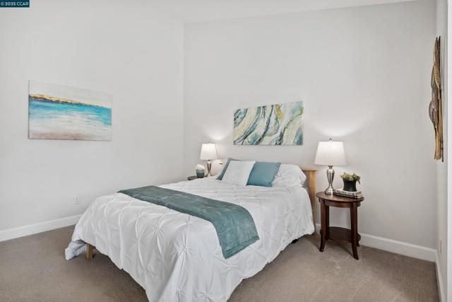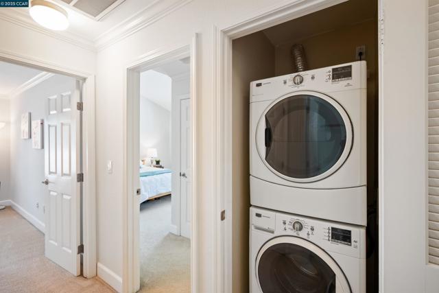 Beautifully maintained Eastridge upper-level condo at the top of San Ramon’s Bollinger Canyon Rd. Gated community w/in a mile of City Center, year-round farmers market, The Marketplace shops, restaurants, Central Park, library, community ctr, Iron Horse Trail. 1074+/-SF. 2 bds w/en suite bathrooms, mirrored closet drs. 2 bathrooms w/single sink vanities, tub/shower combos. Inviting entry. Vaulted ceilings. Fresh int paint. Crown molding. Tile & carpeted floors. Updated central AC (2019). Abundant natural light. Living rm w/wood-burning fireplace, slider to view balcony & storage closet. Dining area, ceiling fan/light. Well-appointed kitchen w/granite counters, richly stained cabinetry, upper glass-faced cabinets, stainless steel refrigerator, new Samsung range, dishwasher & microwave. Front-facing window over stainless-steel sink. Washer/dryer behind closet drs. Multiple storage closets. Updated central AC (2019). Updated exterior. Exclusive enclave of condos on park-like grounds. Towering redwoods. Walking trails. App-controlled security gate. Access to 2 swimming pools, spas, gym. Entertain family & friends at clubhouse. Located between Canyon Lakes & The Bridges Golf Courses. Near freeway. Top-rated SRVUSD schools w/in 2 mi. Assigned parking space. Abundant guest parking.