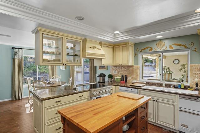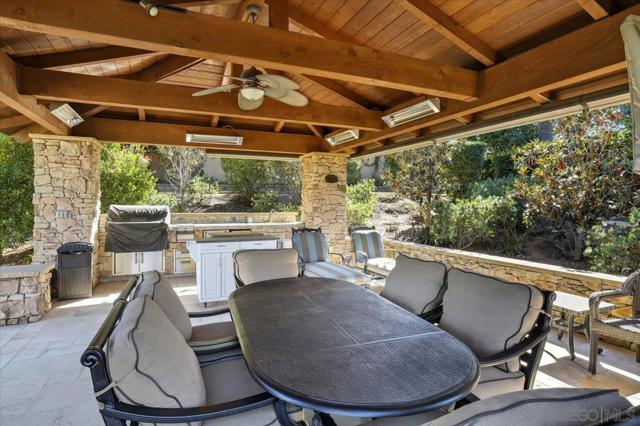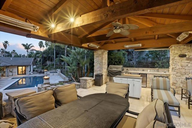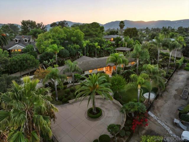 Welcome to a sanctuary of sophistication in West Escondido. This gated estate blends timeless design with modern luxury, offering a lifestyle of serenity, beauty, and effortless entertaining. From the moment you arrive, the circular driveway and lush gardens set a gracious tone. Beveled glass doors open to a sunlit interior where vaulted ceilings and travertine floors lead to a living room anchored by a dramatic stone fireplace and panoramic views of nature. Designed for gatherings, and fun… See Supplement A circular drive leads to a stunning entry framed by lush landscaping and beveled glass doors. Inside, vaulted ceilings, travertine floors, and a dramatic stone fireplace define the living room. The formal dining room opens to the pool via folding glass doors and features custom built-ins. The kitchen includes a butcher block island, Miele coffee station, breakfast nook, pantry, and pass-through window to the patio. Adjacent is a spacious laundry room with ample cabinetry. The home offers 5 bedrooms, including a luxurious owner’s suite with walk-in closet, spa-like bath, and an attached office with built-ins. Outdoor amenities include a 38’ lap pool, raised spa, fire-and-ice features, private cabana, putting green with sand trap, and a 23×19 ft gazebo with granite counters, BBQ, heaters, fans, and TV. Fruit trees, rose garden, scenic walkway, and night lighting complete the resort-style grounds. Epoxy-floored garage with LED lighting and storage. A rare opportunity for refined living. The kitchen is both warm and functional, with a butcher block island, Miele coffee station, breakfast nook, and pass-through window to the patio. A spacious laundry room adds everyday ease. The owner’s suite is a retreat unto itself, with a spa-inspired bath, walk-in closet, and an adjoining office with granite counters and built-ins. Three additional bedrooms offer comfort and privacy. Outside, the grounds unfold like a private resort: lap pool, raised spa, fire-and-ice features, putting green, cabana, and a fully equipped gazebo with scenic walkway. Fruit trees, a rose garden, and curated lighting complete the ambiance. This is more than a home—it’s a destination.