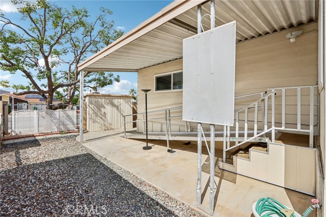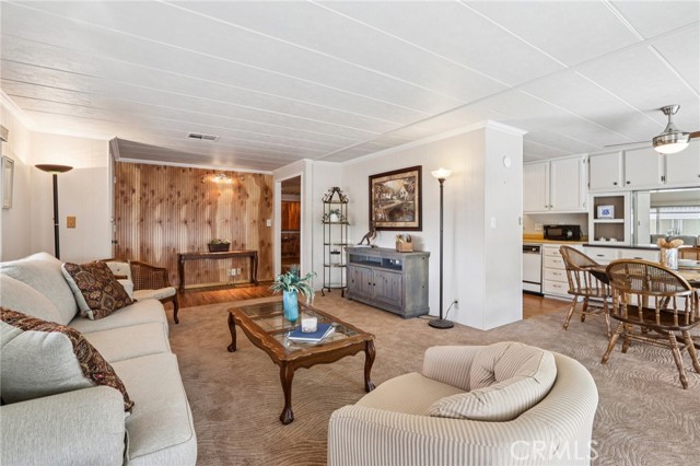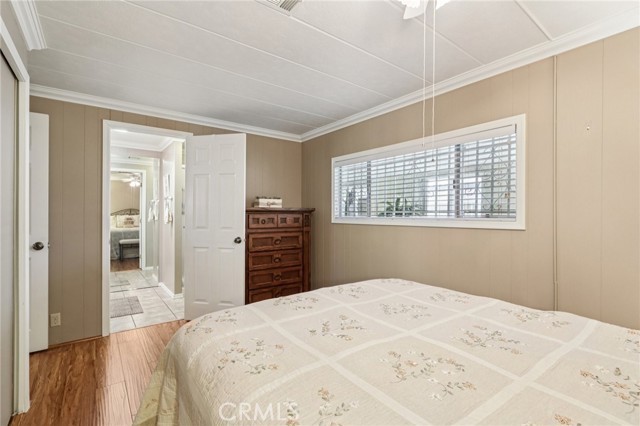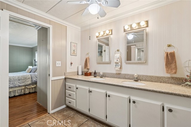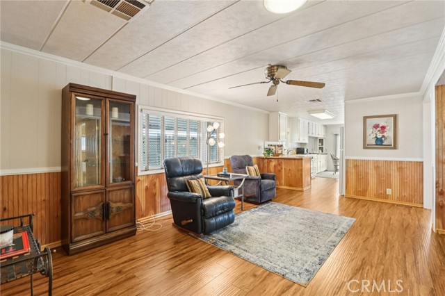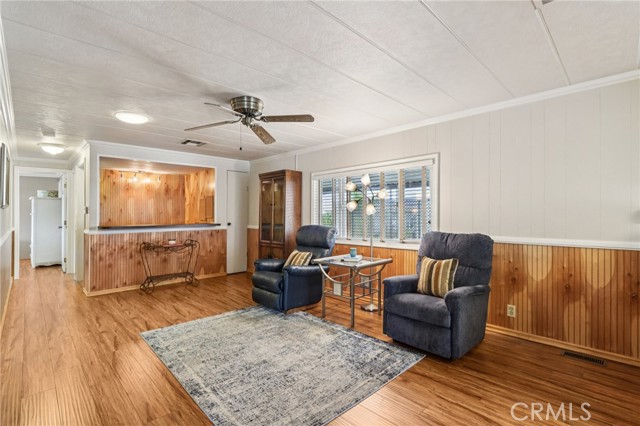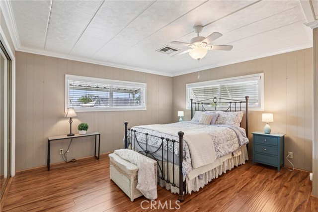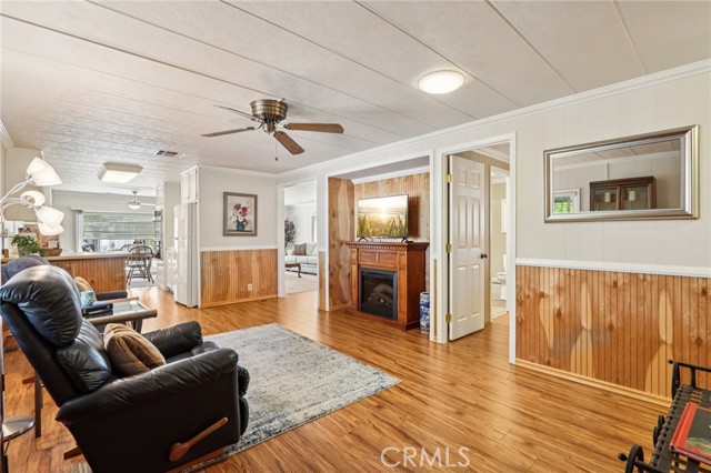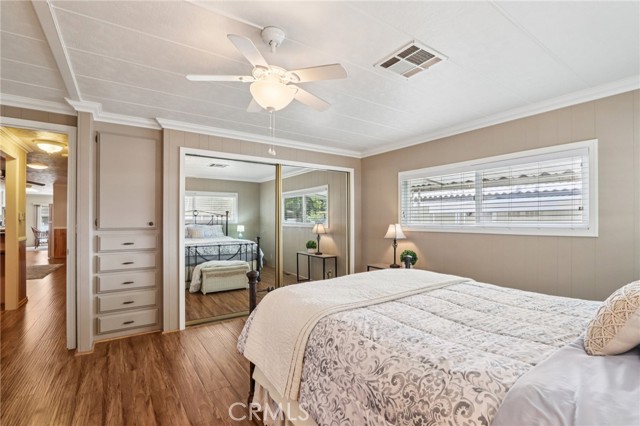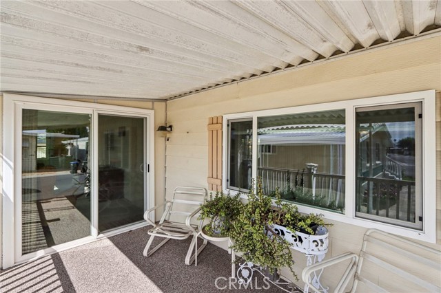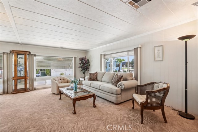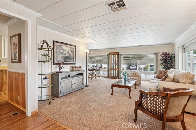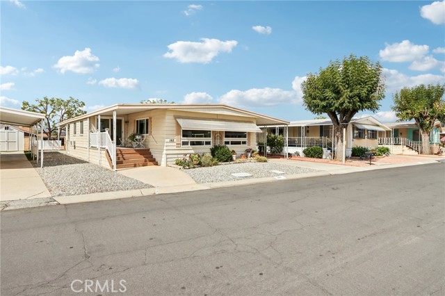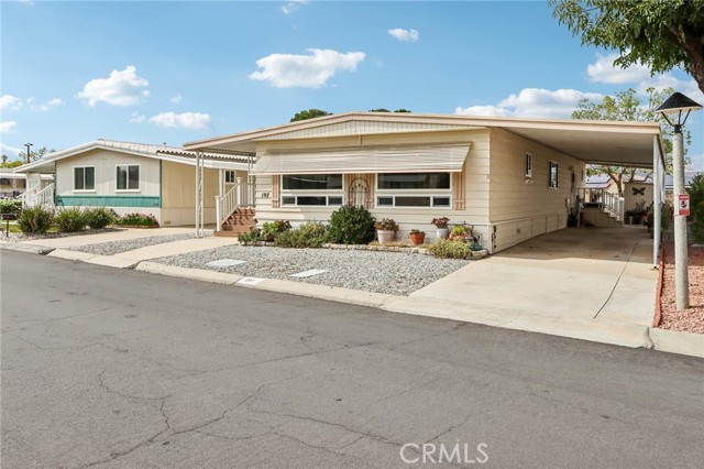Welcome to 27601 Sun City Blvd #197, Located in the desirable Sun City Mobile Estates of Menifee. This spacious double-wide home features 1,440 sqft of living space with 2 bedrooms and 2 bathrooms, plus a connected sunroom and an aluminum wheelchair ramp for added convenience. Recent energy-efficient upgrades include dual-pane vinyl windows, window shades, a new AC unit, new roof and a water heater, ensuring comfort and savings year-round. Step inside to find new wood laminate flooring, designer carpet, and crown molding that add warmth and elegance. The living room is designed for entertaining, flowing seamlessly into the dining area and kitchen, where white cabinetry and butcher block-style countertops create a stylish contrast. An additional seating area offers a cozy spot to relax by the electric fireplace or enjoy a drink at the built-in bar. Down the hall, both bedrooms feature en-suite bathrooms for privacy and convenience. The master bedroom is a serene retreat with mirrored closet doors, a ceiling fan, and multiple windows that fill the space with natural light. Outside, enjoy ample covered parking, storage sheds, and a deck, perfect for soaking in the beautiful Southern California weather. This home is a must-see for those looking for comfort, and style. The 55+ community itself is vibrant and active, offering amenities such as a pool and spa, bingo, chair volleyball, card games, and holiday parties for residents to enjoy. Don’t miss out on the opportunity to make this house your home and be a part of a wonderful lifestyle that awaits you in this welcoming community.