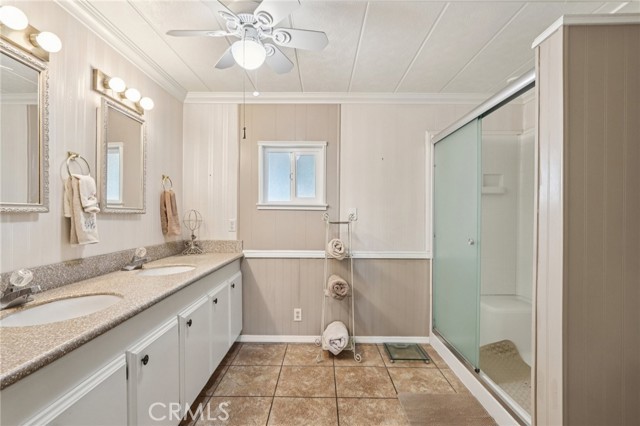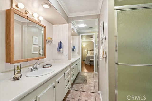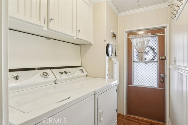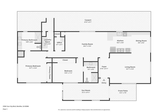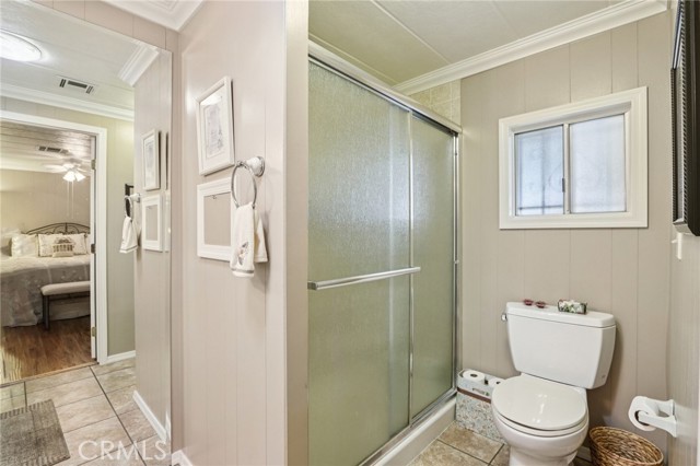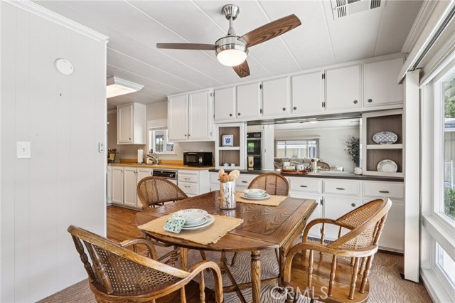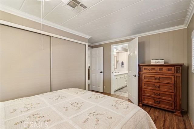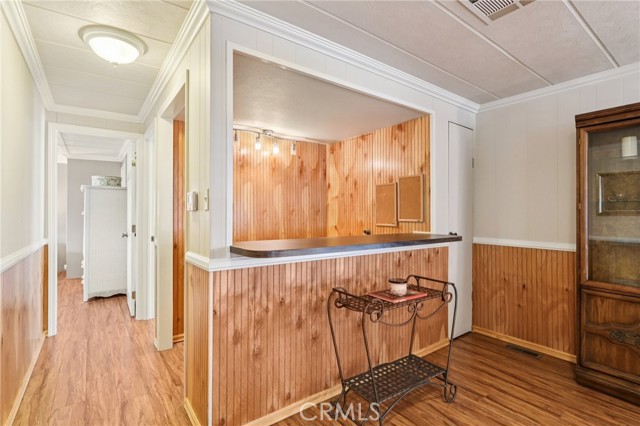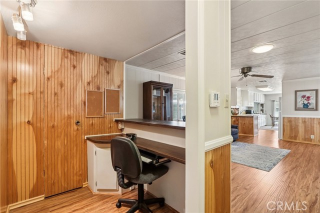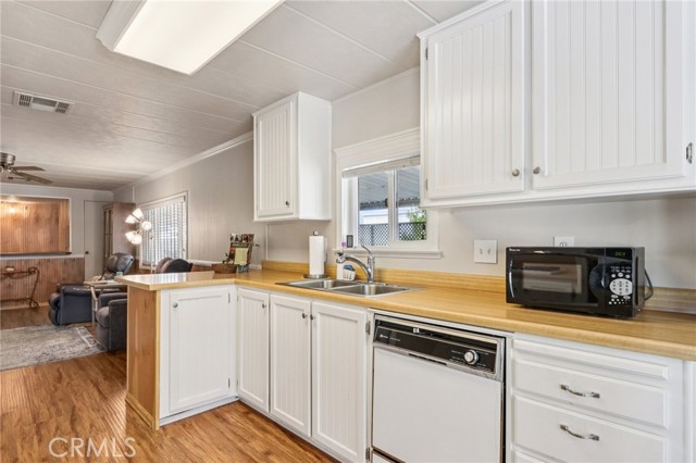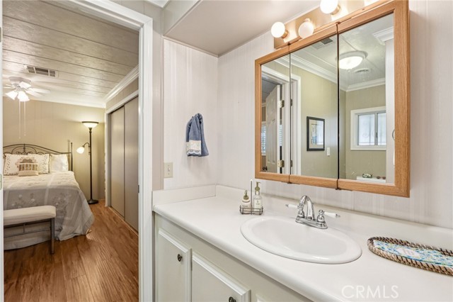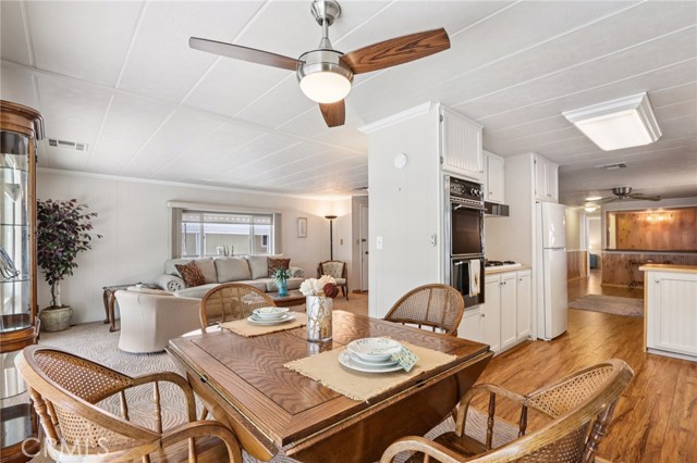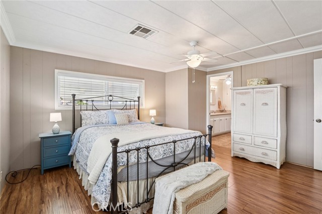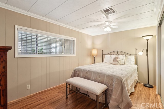 Welcome to 27601 Sun City Blvd #197, Located in the desirable Sun City Mobile Estates of Menifee. This spacious double-wide home features 1,440 sqft of living space with 2 bedrooms and 2 bathrooms, plus a connected sunroom and an aluminum wheelchair ramp for added convenience. Recent energy-efficient upgrades include dual-pane vinyl windows, window shades, a new AC unit, new roof and a water heater, ensuring comfort and savings year-round. Step inside to find new wood laminate flooring, designer carpet, and crown molding that add warmth and elegance. The living room is designed for entertaining, flowing seamlessly into the dining area and kitchen, where white cabinetry and butcher block-style countertops create a stylish contrast. An additional seating area offers a cozy spot to relax by the electric fireplace or enjoy a drink at the built-in bar. Down the hall, both bedrooms feature en-suite bathrooms for privacy and convenience. The master bedroom is a serene retreat with mirrored closet doors, a ceiling fan, and multiple windows that fill the space with natural light. Outside, enjoy ample covered parking, storage sheds, and a deck, perfect for soaking in the beautiful Southern California weather. This home is a must-see for those looking for comfort, and style. The 55+ community itself is vibrant and active, offering amenities such as a pool and spa, bingo, chair volleyball, card games, and holiday parties for residents to enjoy. Don’t miss out on the opportunity to make this house your home and be a part of a wonderful lifestyle that awaits you in this welcoming community.