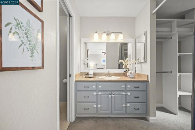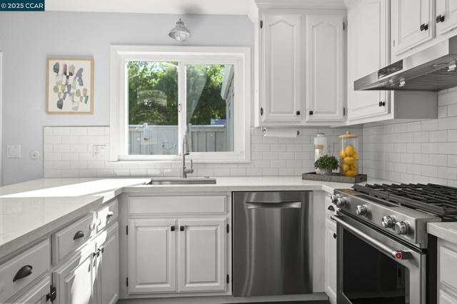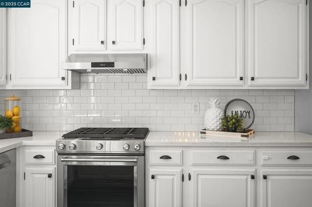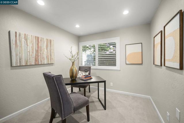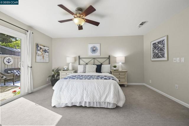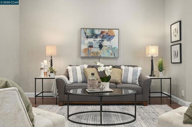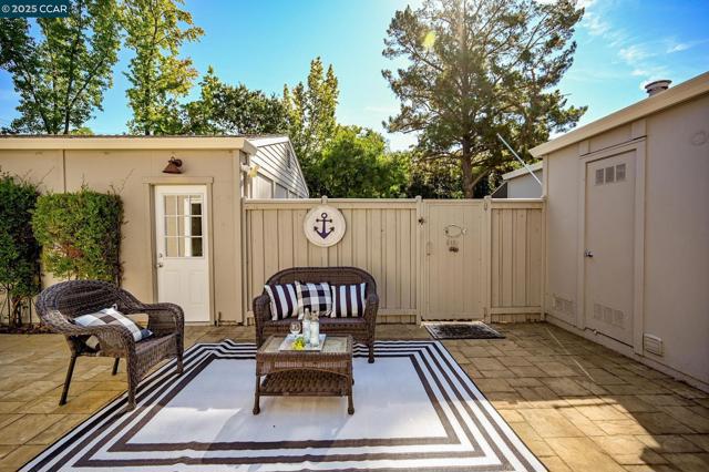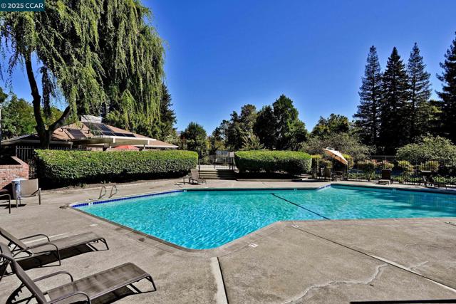 Beautiful single-story 3-bed, 2-bath townhouse with 1,390 sq ft of comfortable living. The kitchen features stainless steel KitchenAid appliances, new dishwasher, granite counters, tile flooring, shiplap half wall, and upgraded lighting. Bathrooms have granite vanities and upgraded vent fans. Primary suite includes a sliding glass door. Nest thermostat and security cameras included. Further updates include: newer flooring (laminate), Shaw carpets, recessed lighting, plantation shutters, ceiling fans, fresh interior texture/paint, and an upgraded electrical panel. Enjoy a private backyard with pavers and water fountain, central AC, a 2-car garage, plus 2 additional parking spaces next to the garage. Located at the back of the complex with direct Iron Horse Trail access. Community amenities include a clubhouse, tennis courts, and pool. Close to Baldwin Elementary, Rose Garden shopping, dining, and downtown Danville.