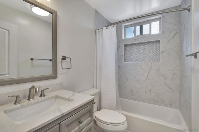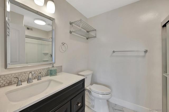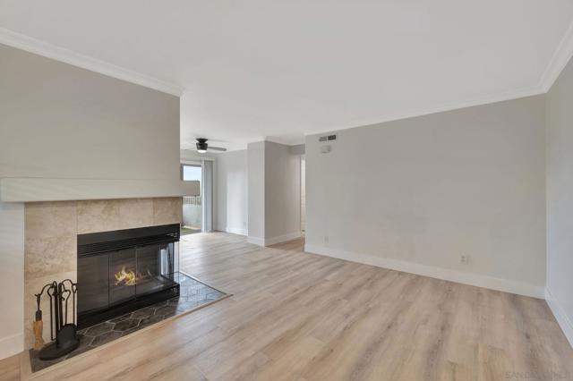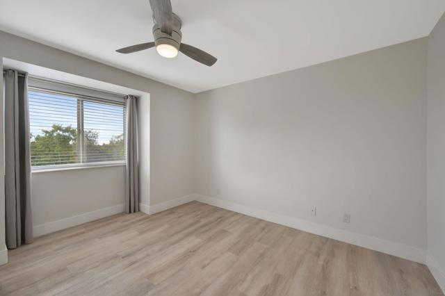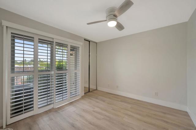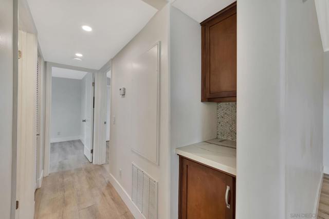 Stunning top floor condo with gorgeous finishes! This has to be the most upgraded and best located condo in the complex! There is stylish LVP flooring with dual pane windows and sliders throughout. The kitchen is amazing with modern cabinets, counters and tile work. The dining room has a private patio with views. The primary bedroom features another private balcony as well as a beautiful bath with walk-in shower. Both bedrooms have full-length mirrored doors and the hall bath has a tub-shower condo with wonderful tile work. There is central heating and AC as well as a detached two-car tandem garage with tall ceilings. This wonderful property is centrally located and close to SDSU.