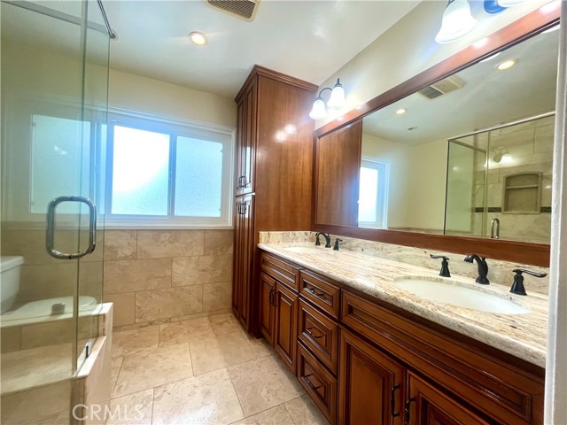 Open House Monday 22nd 1:30-3:00 Come see this newly painted, beautiful South of the Blvd. Woodland Hills home in award winning school district. This lovely 4 bedroom, 3 bath home with breathtaking upstairs bedroom views is waiting for you. This family home is set above the street and welcomes you with a charming putting green and fountain in the front of the house and an inviting front-entry with designer stone and oak front doors. Enter from the foyer into the mirrored formal Living Room with a cozy fireplace. The downstairs has been opened up to create an open flow to the kitchen and family room. The eat-in kitchen has updated stainless appliances, a new stainless Refrigerator, travertine tile floors, granite counters, and an antique built-in oakwood china cabinet in the Dining Room area of the Kitchen providing a large amount of storage. From the kitchen there are two sliding glass doors leading out to the well kept covered patio/yard area that has easy-maintenance turf, an in-ground spa/hot tub and a lovely upper deck area for taking in the Sunsets and the spectacular views of the Santa Susanna Mountains. Inside, the wood staircase leads up to built-in hallway storage and the 4 bedrooms – each well-sized. The bathrooms are tiled and have double sinks in both the master and shared bathroom. The large Master bedroom with light-reflecting mirrors has a walk-in closet with built-in organizational system, tiled bathroom with a generous sized glassed shower. Newly done large garage with an ample-sized for two cars, refrigerator and a workspace as well as a brick-ribboned driveway providing 3+ more additional parking spaces. Additional updates include a redone roof, new Heating and Washing Machine. This home has so much to offer. Close proximity to Topanga Mall, Warner Center and other shopping. Gardner included in lease. Showings will be scheduled by appointment only with advance notice.