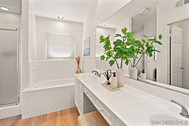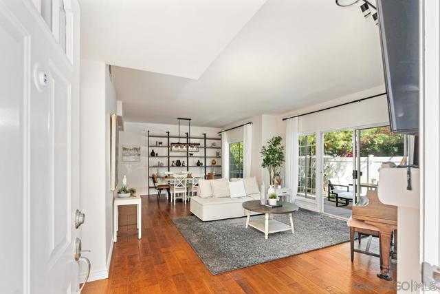 Turn key, two story townhome in La Jolla Gardens, walkable to La Jolla Village Square with restaurants, shopping, theater & more! Minutes to La Jolla Shores beach, UCSD & freeways 5, 805, 15, 52, 163. Spacious, light & bright with one bedroom on the main floor & two master retreats on the second. Loft in between masters, perfect for home office. Upgraded kitchen with granite counter, wood flooring in living. Double-wide private patio. Spacious backyard. Short walk to community pool and spa, and places for pets to roam!