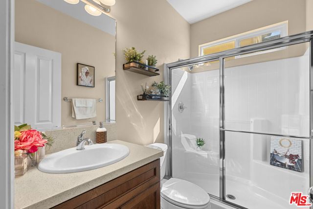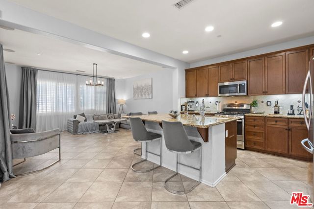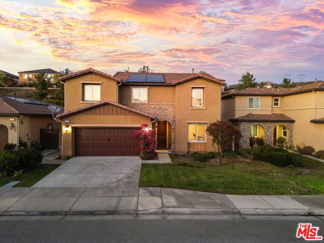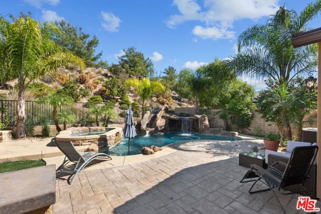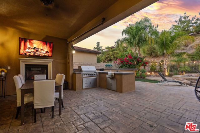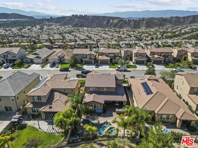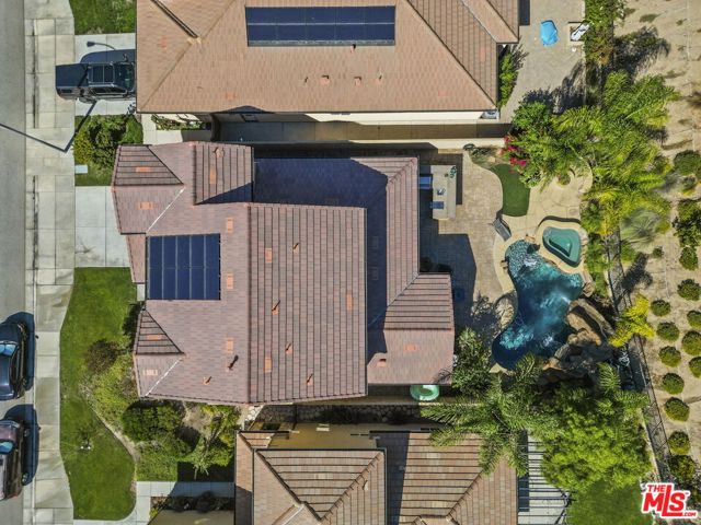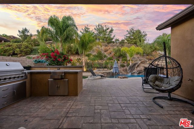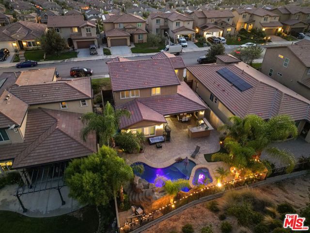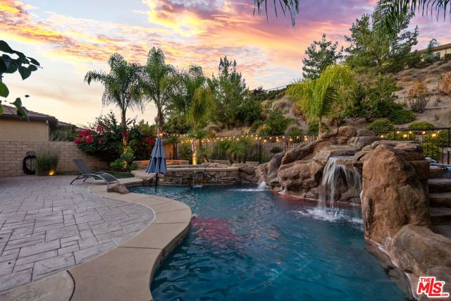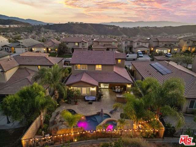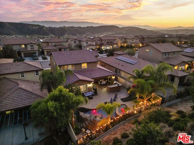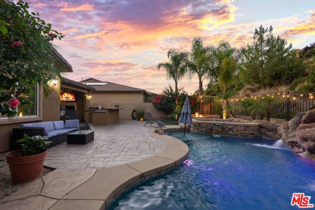Step into the home, everyone will fall in love with! This newer 4-bedroom pool home offers a backyard unlike anything you’ve seen true private resort with romantic hillside views lined with palm trees and string lights. Enjoy a sparkling pool with a waterfall grotto, Baja shelf, relaxing spa, fire pit, and a full outdoor kitchen with built-in BBQ under a covered patio featuring a fireplace, ceiling fan, and mounted TV. Whether hosting summer gatherings or unwinding at sunset, every corner of this home radiates comfort and style. Inside, natural light fills the open-concept living space with a chef’s kitchen boasting granite countertops, stainless steel appliances, walnut cabinetry, and an oversized island. The dining area opens seamlessly to the patio for indoor-outdoor flow. A downstairs bedroom and full bath provide convenience for guests or a home office. Upstairs, the primary suite features a soaking tub, shower, and walk-in closet, plus 2 additional bedrooms & a stylish loft. With 4 bedrooms, 3 bathrooms, a spacious open layout, solar power, plantation shutters, beautiful upgrades & an outdoor oasis, this move-in ready gem perfectly combines style, comfort & efficiency. Homes like this are rare, don’t miss it!