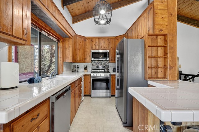 Welcome to Mountain Living at Its Finest!rnrnNestled in the serene Pine Mountain Club community, this spacious 4-bedroom, 3-bath home offers 2,748 sq. ft. of comfortable living space on a generous 10,890 sq. ft. lot. Designed for both relaxation and entertainment, this two-story home features a converted basement that serves as a fun-filled entertainment room complete with a wet bar, perfect for gatherings or game nights.rnrnOnce inside you’ll discover charming wood-toned walls, beamed ceilings with fans, and skylights that fill the living room with natural light. The cozy rock fireplace creates the perfect mountain retreat ambiance, while the deck offers a peaceful seating area to take in the stunning forest and mountain views.rnrnThe kitchen boasts classic white tile countertops, stainless steel appliances, and an adjoining dining area framed by large windows showcasing breathtaking scenery. The primary suite offers a private oasis with a soaking tub and separate shower for ultimate relaxation.rnrnWith four attached garage spaces, ample storage, and plenty of room to spread out, this home beautifully combines rustic charm with modern comfort. Whether you’re seeking a full-time residence or a vacation getaway, 2405 Yellowstone Court invites you to experience the perfect mountain escape.