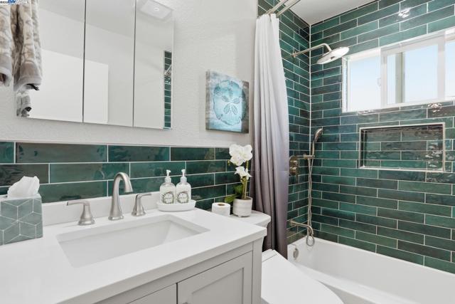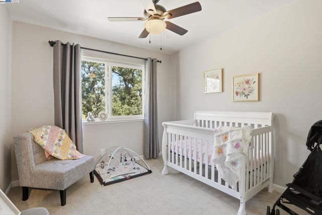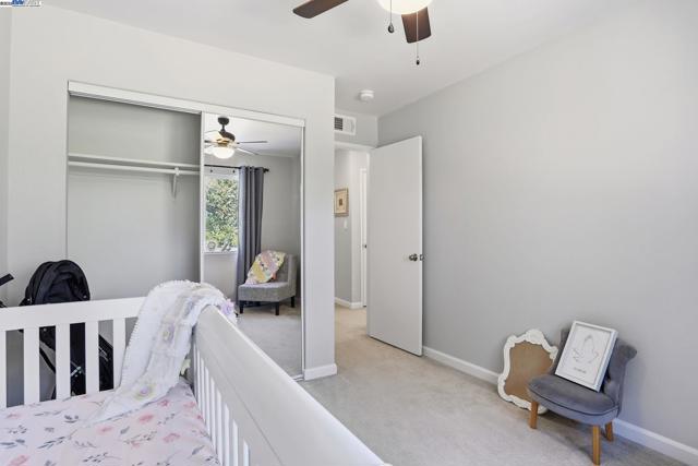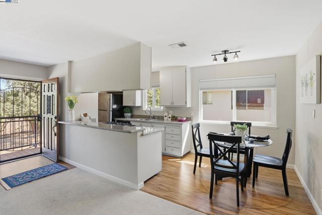 Wonderful opportunity for an investment property or starter home. Move-in Ready! New Paint throughout. Kitchen cabinets recently painted and new shelving installed. Granite slab counter tops and stainless steel appliances. Recently renovated bathroom. Includes Toto washlet bidet and an Alexa voice-controlled smart fan with Bluetooth speakers. New EV Tesla charger in the carport. Single car covered carport with storage closets. Carport includes 3 storage cabinets including 1 walk-in closet with shelving and pegboards. Patio (with patio furniture set) with a view of the creekside area. Far backside, quiet part of the neighborhood – desirable unit #4 upstairs single story. Close proximity to 680 and 580 freeways, BART station, Cubby’s Dog Park, Safeway shopping plaza, and hiking/biking trails on the Pleasanton Ridge (right across the street)! Community common areas include a pool, pool house, pool patio with fire pits, outdoor workout spaces including a pickleball court, free weights, and playground. HOA hosts quarterly community events in the common areas — great sense of community.