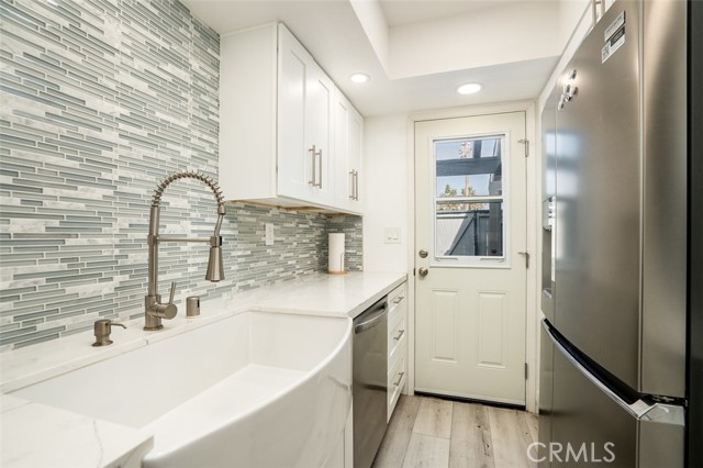Coastal living at it’s best! This stunning beach home resides within the highly sough after Seascape community of Huntington Harbor. The home features many high quality improvements as well as amenities. It all begins with a private enclosed patio overlooking the greenbelt area. As you enter the home, you are greeted by a formal living room with a gas burning fireplace. There is a slider leading from the living room to the front patio. There is also a large dining area flowing into the living room. Next comes the gorgeous kitchen, featuring a total renovation, including all new cabinets with pull outs, a lazy Susan and a pantry, quartz countertops, a mosaic backsplash plus stainless steel appliances with the refrigerator included in the sale. There is also a renovated powder room downstairs with a new quartz countered vanity. The upstairs is well designed with semi primary suites, each offering their own special features. The front bedroom boasts 3 large closets and a balcony with tranquil views of the greenbelt area. The rear bedroom offers a large private balcony as well. The rear bathroom has been remodeled with a tiled surround bathtub/shower, including jets in the tub, along with a new vanity. The front bathroom features a large walk-in shower. The toilet area is shared by both bathrooms. Bonus features include; elegant vinyl plank flooring throughout the home, new paint, smooth ceilings, recessed lighting, ceiling fans and a newer forced air heating system. This lovely home is walking distance to shopping, restaurants, schools, several parks and is only a short bike ride away from the beach. Ocean breezes, amazing sunsets, along with a completely renovated pool and spa area, are all reasons to come visit and call this fabulous condo your new home!