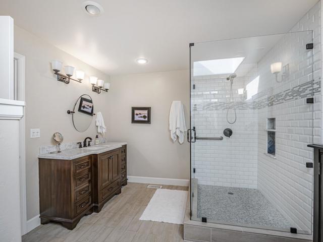 Tastefully updated SINGLE LEVEL 3- bedroom 2 bath home in desirable Rio Del Mar! Engineered hard wood flooring, double pane windows/sliders, solid wood doors,- including front door. EXTRA storage above garage NOT included in total square footage (approximately 250 +/-) with access through garage, – great for Art area or man cave, yoga, or home office! Located minutes from beaches, golf, dining, and top-rated schools, this home offers the best of Aptos living in one of its most established quiet neighborhoods. The thoughtfully designed floor plan provides excellent separation of space while maximizing every corner of the home. The kitchen flows seamlessly into the dining area. Multiple skylights fill the home with natural light. Outdoor spaces are ideal for entertaining and low-maintenance hardscaping. Nearby, enjoy miles of hiking and biking in Nisene Marks State Park. Easy access to freeway.