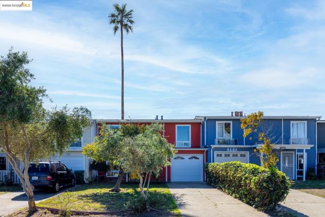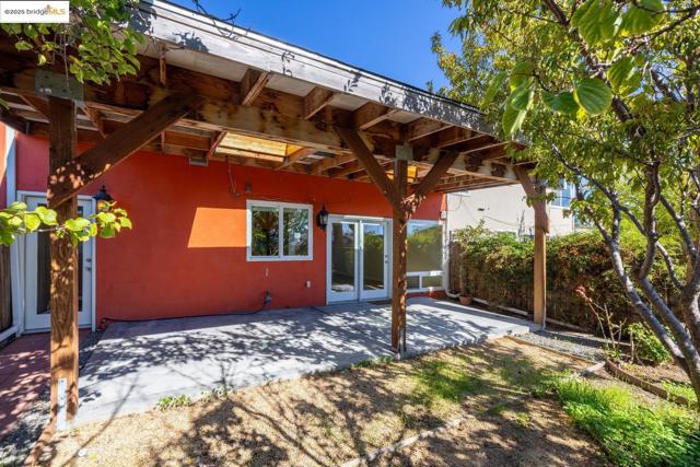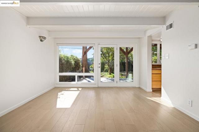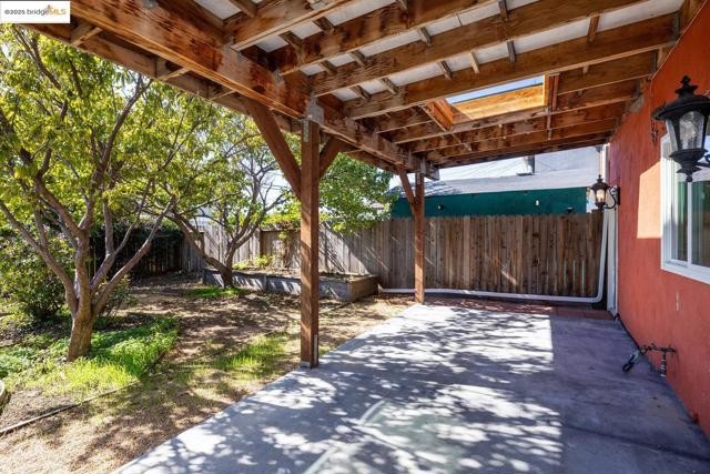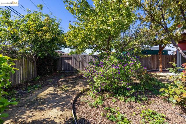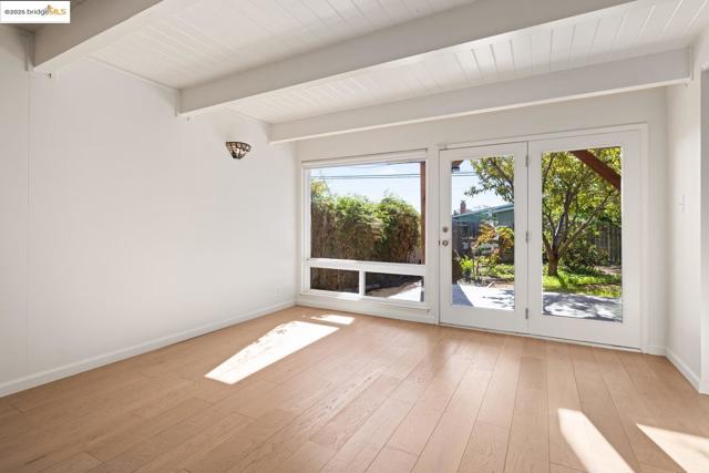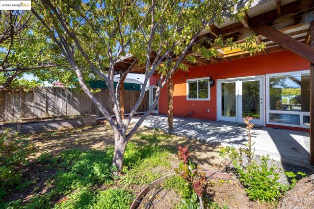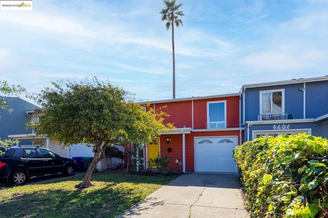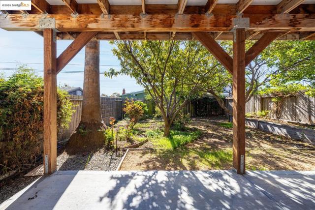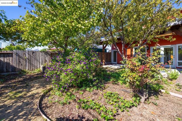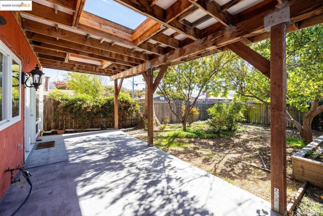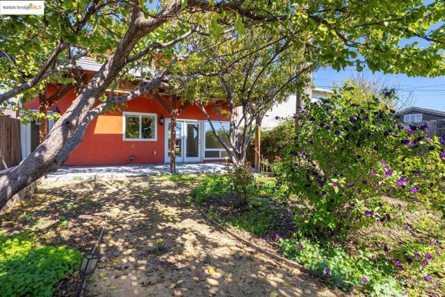 Refreshed and radiant, this mid-century 4-bedroom, 2-bath two-story home blends a sunny beachy vibe with everyday practicality. The main level features open-concept living and dining spaces with beamed ceilings, a stylish kitchen with granite counters, new electric cooktop*, double ovens, stone flooring, under-cabinet lighting, and abundant cabinetry for the home chef. Both upstairs and down, natural light flows easily through generous glass doors and windows, and light-filled rooms create a welcoming atmosphere. Just outside, with direct access from both the living area and kitchen, a private backyard oasis with a large covered patio, mature fruit trees, an iconic palm, planter box, and a meandering decomposed granite path awaits – perfect for morning coffee or weekend gatherings. Additional highlights include fresh interior paint*, newly installed wood flooring and carpeting*, and a one-car garage with interior access, storage, washer/dryer, and utility sink. Just blocks from del Norte BART, the Richmond Swim Center, and neighborhood parks, and with nearby freeway access — this Park Plaza gem is ideal for those seeking relaxed and easy urban convenience. Open Sunday 10/26 from 2-4. *Cooktop, fresh paint, carpets, installed in 10/2025 Property is virtually staged.