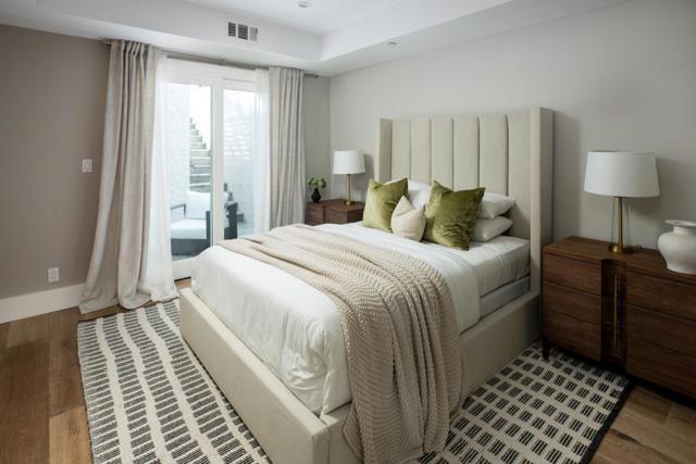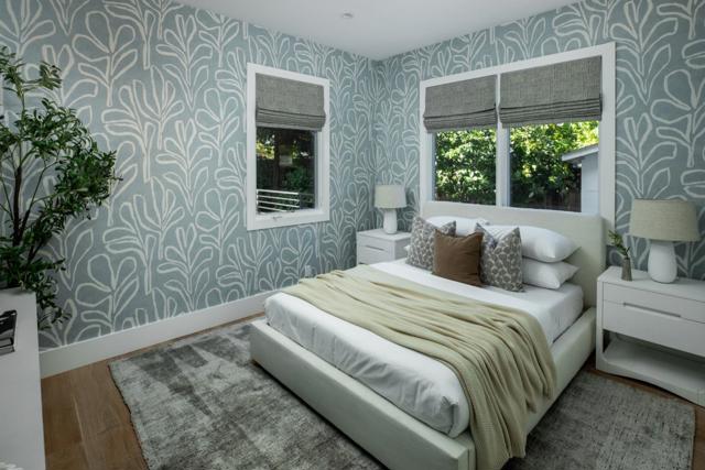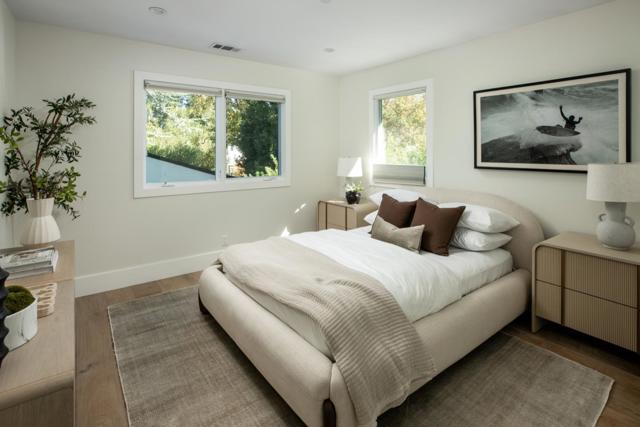 Stunning designer home blending timeless architecture with chic sophistication on one of Menlo Parks most sought-after streets. Spanning three levels, the open, light-filled design with soaring ceilings, crisp white millwork, European white oak floors and a formal living and dining room in addition to the open concept kitchen/family room. The chefs kitchen features white cabinetry, quartz counters, and a waterfall island adjoining the family room with marble fireplace and retractable glass doors to the outstanding rear yard. A main-level guest suite adds convenience. Upstairs, the primary suite offers two walk-in closets, a private balcony, and spa bath with dual vanities, jetted tub, and rainfall shower, plus two additional bedroom suites. The lower level includes a recreation room with bar, theatre, fitness room, and private bedroom suite and half bath. The rear yard is an entertainers dream with fire pit, spa deck, synthetic lawn, huge bluestone patio, privacy and built-in barbecue. Additional features: 3-zone HVAC, Nest thermostats, EV charging, programmable lighting, just down the block to the pedestrian bridge to Stanford Shopping Center, Stanford University and proximity to downtown Menlo Park, excellent Menlo Park Schools.