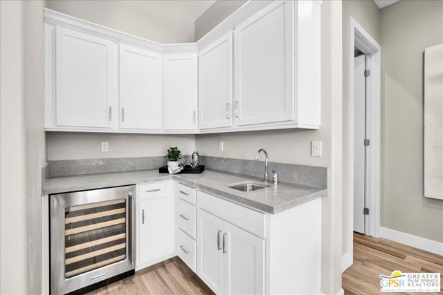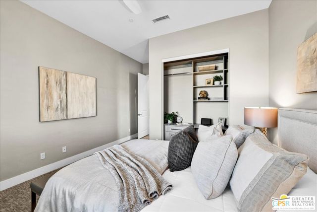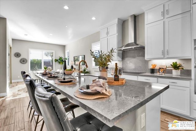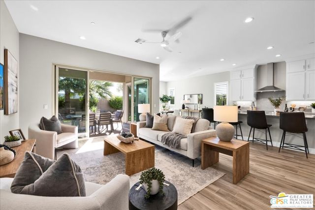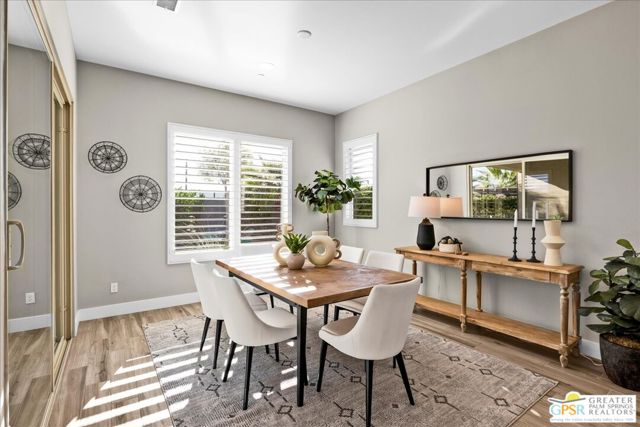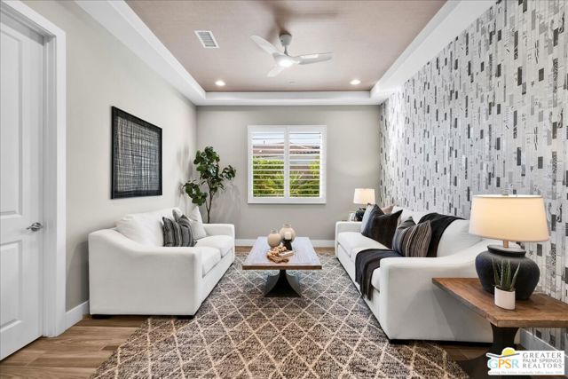 Elegant Desert Retreat in Del Webb Rancho Mirage – Step into refined desert living with this stunning Phase 4, Expanded Plan 7 Refuge featuring a timeless Prairie elevation. From the moment you enter, you’re greeted by elegant tray ceilings in the round foyer and down the entry hall, accented by designer-selected wallpaper and rich wood-look plank tile flooring that sets a tone of sophistication throughout. This highly upgraded residence offers exceptional comfort and style, featuring plush upgraded carpet, 5 1/2″ baseboards, and high-end ceiling fans in every room. The versatile floorplan includes dual ensuite bedrooms plus a powder room and a flex space with tray ceiling and walk-in closet – ideal as a media room, den, or easily converted third bedroom. At the heart of the home, the open-concept kitchen flows seamlessly into the dining and living areas. A chef’s delight, it boasts quartz countertops, upgraded 42″ upper cabinets and jewel cabinets with crown molding, soft-close drawers, induction cooktop, stainless appliances, and a large island with ample seating. The living area showcases an upgraded wet bar with a high-end wine fridge and dual sliding glass doors that open to the covered patio, creating effortless indoor-outdoor living. The primary suite is a serene sanctuary featuring tray ceilings, abundant natural light, and views of the lush backyard. The ensuite bath is a spa-worthy escape with a zero-threshold rain shower, dual vanities topped with natural granite, and a custom walk-in closet. The secondary suite, located on the opposite end of the home for added privacy, is equally impressive – offering San Jacinto Mountain views, a built-in desk and closet system, and full bathroom with granite countertops, and designer wallpaper accents. Additional highlights include leased SOLAR, a thoughtfully designed mudroom with a built-in shoe station and coat hooks, a spacious laundry room with cabinetry, granite counters, utility sink, and skylight. The fully finished, climate-controlled three-car garage features sealed floors, a 220V EV outlet, dedicated workshop space with upgraded outlet package, and remote-controlled HVAC for year-round comfort. The backyard is a private oasis, complete with real grass, natural stone walkways, citrus trees, ambient lighting, and peekaboo mountain views. A covered patio with remote-controlled zipper shade and a full rain gutter system add comfort and practicality to this outdoor retreat. Located near the clubhouse within the prestigious guard-gated 55+ community of Del Webb Rancho Mirage, residents enjoy access to world-class amenities including pools, spa, tennis and pickleball courts, fitness center, and a vibrant social scene. Experience the perfect balance of elegance, comfort, and resort-style living – this home truly stands apart.