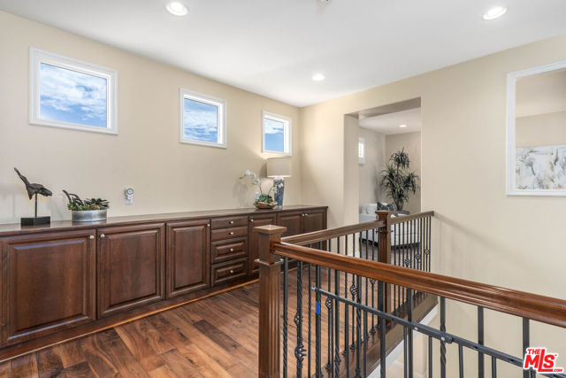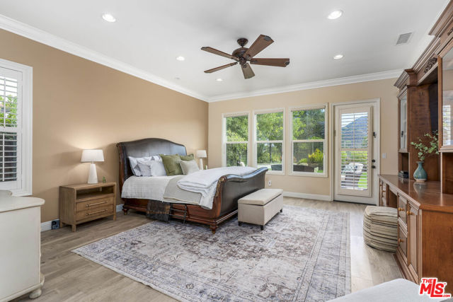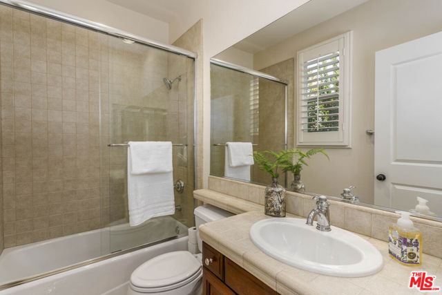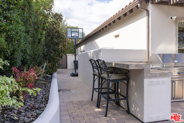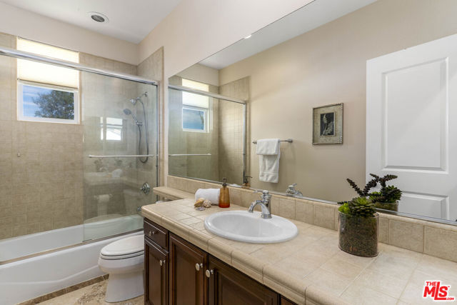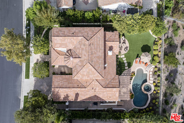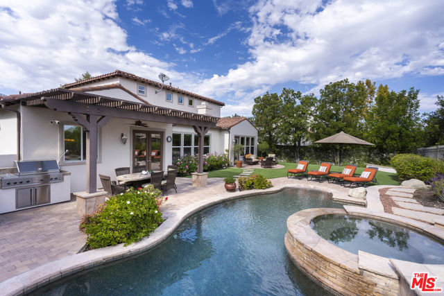 Spectacular View Estate in The Oaks of Calabasas. Welcome home to the Oaks, the most prestigious gated community in Calabasas. This 4-bedroom, 5-bath estate offers beautiful views, a private and manicured 11,000 sq ft lot, and over 4200 sq ft of thoughtfully designed living space. With the primary suite and an additional large en suite bedroom conveniently located on the main level, the home lives like a single story, while high ceilings, abundant natural light, and a warm, welcoming layout create the perfect setting for both everyday living and effortless entertaining. Designed with both comfort and entertaining in mind, the main level features a desirable open floor plan. Just off the formal entry, there is a den or office bathed in sunlight. A formal dining room follows with plantation shutters, which flows into a spacious family room with a stone fireplace, custom entertainment center, and walls of windows framing the beautiful yard and mountain backdrop. The chef’s kitchen offers granite countertops, a large island with seating, Viking appliances, built-in desk, walk-in pantry, and butler’s pantry. A bright, sunny eat-in area features double doors that open seamlessly to the backyard and covered loggia, extending the living space outdoors. Two main-floor bedroom suites include a large en suite bedroom with a built-in desk at the front of the home as well as the primary retreat with backyard access, generous windows, and a spa-style bath with dual sinks, jetted tub, standing shower, and walk-in closet. Upstairs, a bonus TV/playroom provides endless options and two additional en-suite bedrooms with walk-in closets complete the smart floor plan. The meticulously maintained backyard was built for entertaining, with a pool with waterfall feature, beach entry and spa as well as a built-in BBQ, loggia with fan, turf lawn, and privacy landscaping all set against views of the surrounding hillsides. The Oaks of Calabasas offers luxurious community amenities, including a 24/7 guard-gated entrance, a community center with an Olympic-sized swimming pool and cabanas, a state-of-the-art fitness center, championship tennis and sport courts, private parks and walking trails, a kids’ splash pad and playground, and a private clubhouse for gatherings and events. Ideally located just minutes from upscale shopping, dining, and the beautiful beaches of Malibu, this residence offers both prestige and convenience in one of Calabasas’s most coveted neighborhoods.