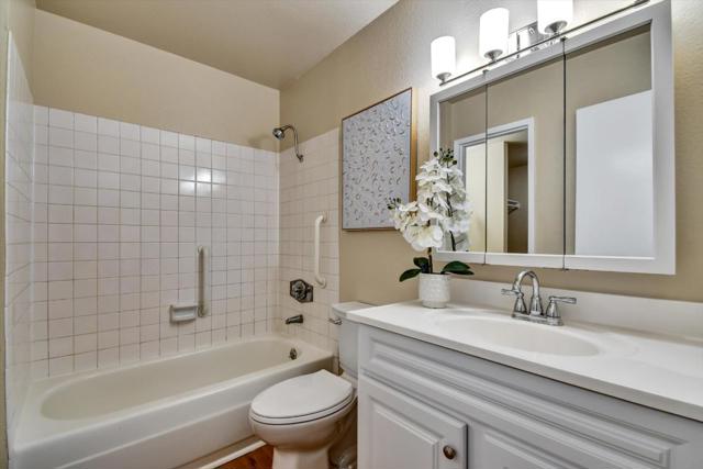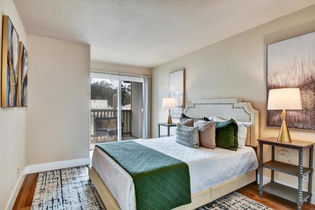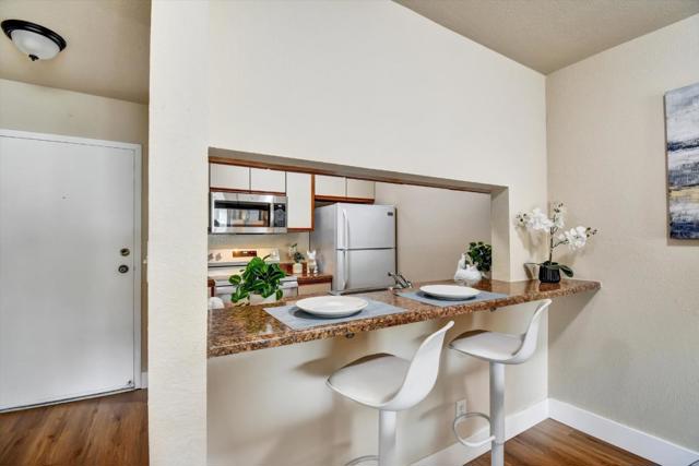 Welcome to this charming top floor 2 bedroom, 1-bathroom residence. This 817 sq ft home offers a practical and inviting living space. The kitchen is well-equipped with modern amenities, including a dishwasher, new built-in microwave, new electric oven range, and refrigerator, making meal preparation a breeze. The living-room is seamlessly integrated with the kitchen, providing a spacious, open area for relaxation and entertainment. Both bedrooms each feature walk-in closets offering ample wardrobe & storage space and private decks. The wood laminate flooring throughout the home is designed for comfort and ease of maintenance. The electric marble-faced fireplace adds a warm & cozy touch to the living area. New double pane patio sliding glass doors. Residents can enjoy a range of community amenities, including a fenced, heated pool with a spa, and sauna, as well as facilities like a gym, kennel/dog run, and basketball courts. Community laundry facilities are available for convenience. This home is ideal for those seeking a vibrant community with excellent amenities. Open House: Sunday, Nov 2, from 1-3pm