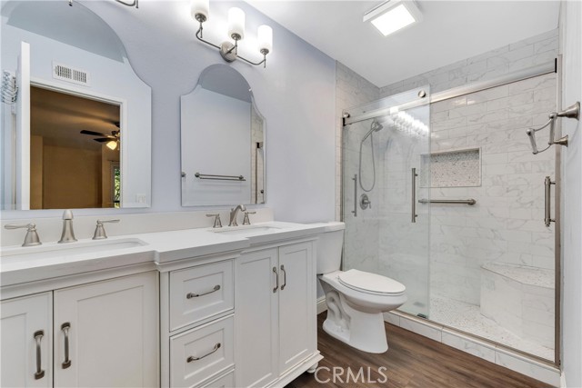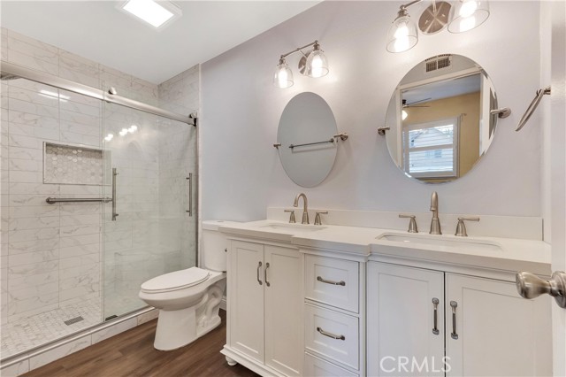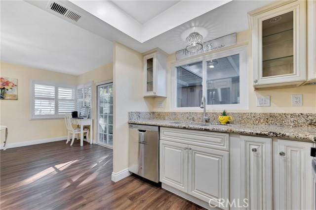This beautifully maintained 2 bed, 2 ½ bath, nearly 1600 sq ft end-unit townhome blends space, comfort, and timeless appeal within a secure gated community, part of the sought after Franciscan complex at the center of Winnetka. Filled with natural light and pride of ownership, the home features a bright, open floor plan with smooth ceilings, plantation shutters, dual pane windows, and durable, luxury vinyl flooring throughout. The inviting living room opens to a large dining area, versatile enough to serve as an informal living space with sliding glass door out to the back patio. The remodeled kitchen forms the heart of the home, perfect for entertaining or enjoying preparing meals, offering granite counters, light cabinetry with stylish glass fronts, stainless steel appliances, and recessed lighting set in a tray ceiling. An updated ½ bath on the first level is convenient for guests. Up the stairs, brightened by a large skylight, are two en-suite bedrooms. The spacious primary suite features dual closets, a ceiling fan, and a sliding glass door to a private balcony, with a beautifully redone bath offering a dual sink vanity and a large walk-in shower with tile enclosure and built-in seat. The secondary suite includes plantation shutters, dual closets, and its own remodeled ¾ bath with dual sinks. Additional features include an updated electrical panel, and newer HVAC system ensure modern comfort and reliability. Out back is a private covered patio bordered by brick planters and a wood fence, perfect for relaxing or entertaining. Beyond is the detached two-car garage with laundry hookups and access from the private drive behind. Part of the Franciscan III community, the home has access to the community grounds, pool, and spa. Move-in ready yet offering the opportunity to personalize over time, this bright and well-cared-for home captures the best of comfort and practicality in a desirable Winnetka location near shopping, parks, and major commuter routes. Don’t miss out on this one!