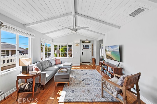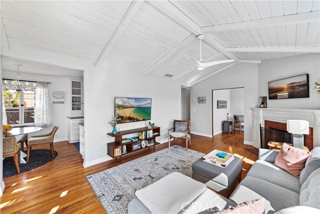 AVAILABLE January 2026 through June 2026. This quintessential meets coastal modern home comes fully Air-Conditioned and turnkey Furnished with 3 bedrooms + 1 Den + 1 Office. This is an exclusive opportunity to rent on one of the most desirable hometown streets of Laguna Beach, right in the heart of our community, with a real taste for our local vibe and yet a short walk to the best beaches, restaurants and shops. Great curbside appeal, and meticulously landscaped front entry accented with long driveway for easy two car tandem parking and ocean views. Walk through a priceless home that showcases pride of ownership and is completely furnished and ready for your next Laguna adventure. This lovely home offers light and bright vaulted ceilings with a coffered living room fireplace, real hardwood floors throughout, gas appliances, and air conditioning. Spacious galley kitchen with farmhouse sink and side access to rear sun patio that is privately enclosed with outside hot and cold shower to wash off beach sand. Third bedroom is detached from the main house with an adjoining room with a closet and space for an office. Two bedrooms in the main house includes a second full bath with bathtub and spacious ensuite main bedroom. Stackable washer and dryer for laundry in closet.