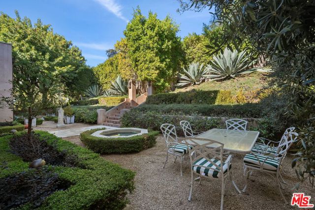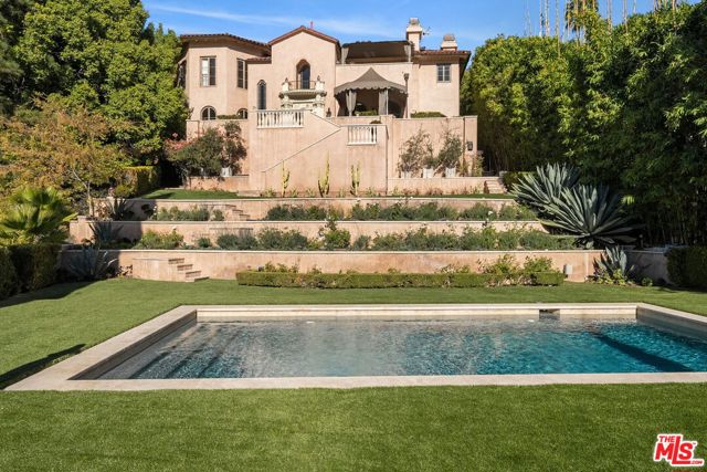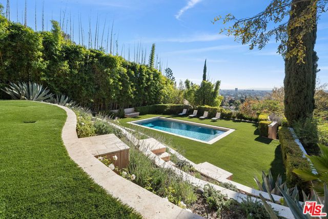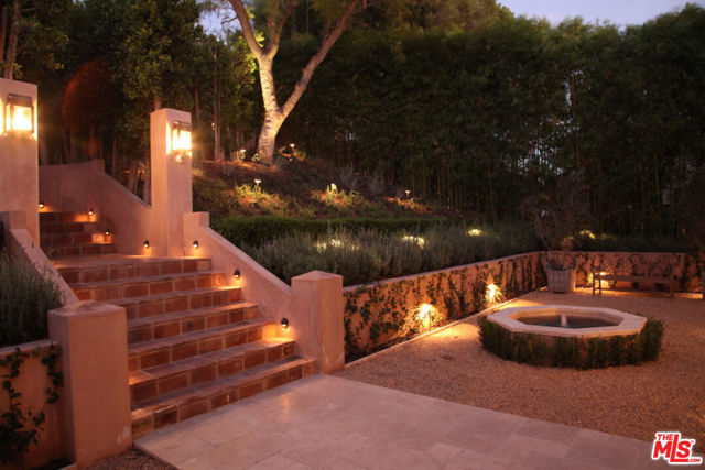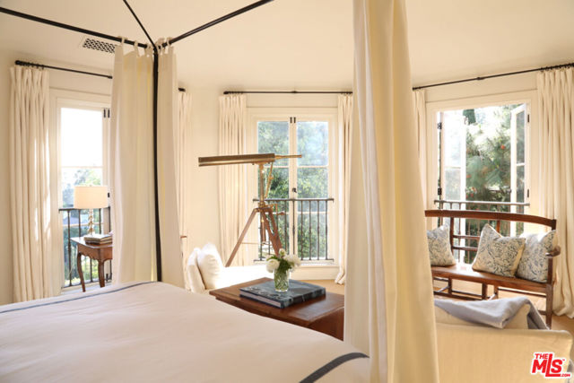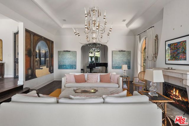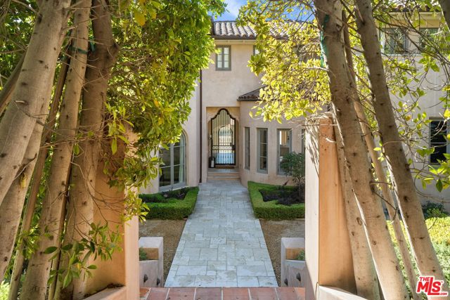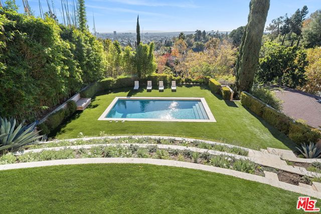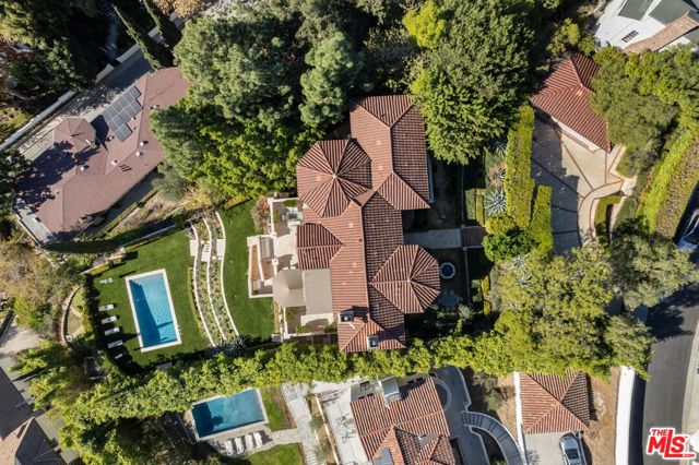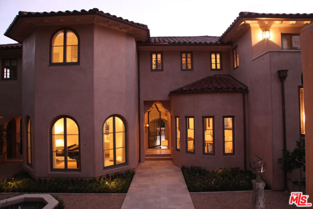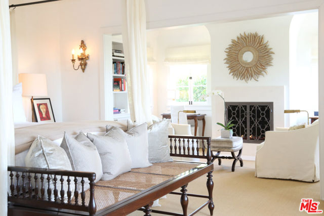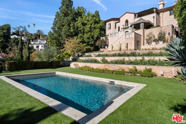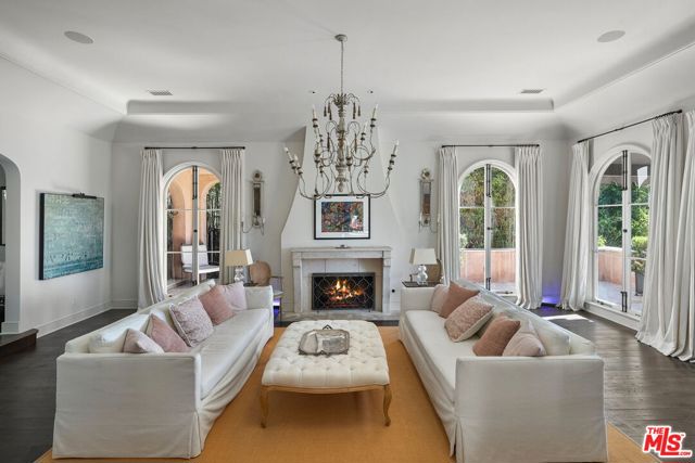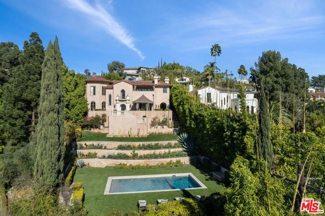 Capturing spectacular city views from nearly every vantage point, this gated Spanish Colonial estate offers unparalleled privacy and elegance in the Hollywood Hills. The luxurious 4 bed, 6 bath Main house and 1 bed 1 bath Guest House property comes fully furnished across three levels, seamlessly integrating classic Spanish Revivalist style with modern functionality. The main level features a chefs kitchen complete with Carrera marble countertops and center island, dual dishwashers, SubZero refrigerator and Wolf range. A spectacular living area blends sophistication and style with a limestone fireplace and expansive windows, filling the space with natural light. Music enthusiasts will love the custom soundproofed studio and vintage console. Upstairs await two generous secondary bedrooms and the impressive primary suite and adjacent sitting area that gazes out to city lights from a private deck and fireplace. Retreat to the lower level to exercise in the fitness room, and unwind in the sauna, wine cellar, study and media room. Attached 1 bedroom guest quarters provide visitors with a space to call their own. All embraced with magnificent amenities outside, including a sparkling pool with swim-resist jets and a tranquil fountain, making this property a unique indoor/outdoor paradise.