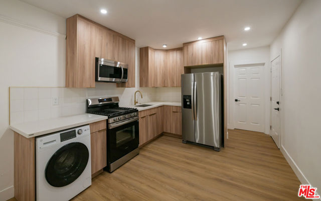 Step into elevated Hollywood living with this fully renovated studio at 5729 Carlton Way a chic, move-in-ready retreat that perfectly blends modern design with everyday comfort. Thoughtfully updated from top to bottom, this residence showcases high-quality craftsmanship, designer finishes, and a bright, open layout ideal for city living. The light-filled interior welcomes you with oversized windows, warm wood-style flooring, and sleek recessed lighting that create an inviting ambiance. The contemporary kitchen is both stylish and functional, featuring quartz countertops, stainless steel appliances (including gas range, microwave, and refrigerator), custom cabinetry, and designer tile backsplash. A built-in washer/dryer combo adds convenience without sacrificing space. The flexible layout offers room for both rest and productivity, with a cozy living/sleeping area and an intimate dining nook that easily doubles as a home office. The bathroom feels like a private spa, complete with a floating vanity accented by gold hardware, a framed mirror, and a glass-enclosed shower surrounded by refined tile work. Set on a peaceful street just moments from Hollywood & Highland, the Walk of Fame, Trader Joe’s, Equinox, and Runyon Canyon, this location offers the perfect balance of tranquility and access. Blending designer style with functional sophistication, Unit 1/4 at 5729 Carlton Way offers a rare opportunity to experience Hollywood living at its best.