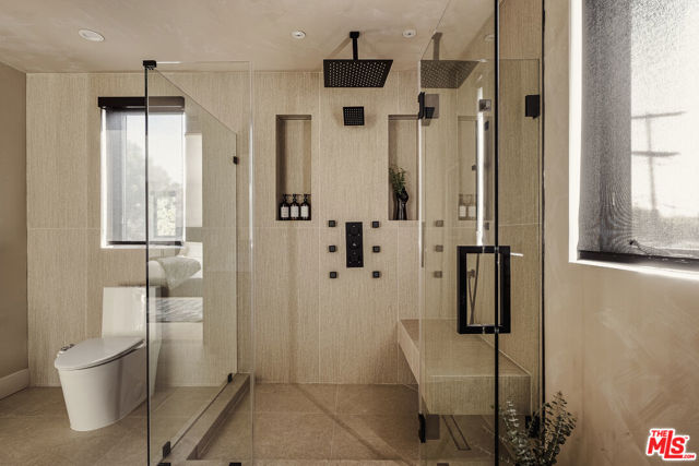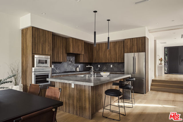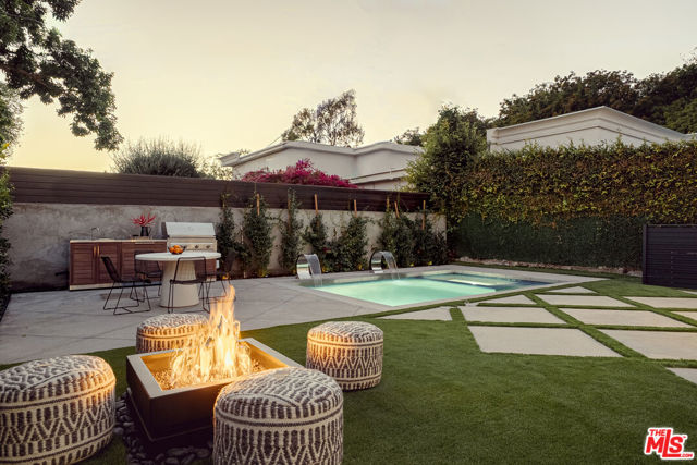 Experience modern luxury in this fully reimagined, 3-bedroom, 3-bath villa nestled in the heart of coveted West LA. Beyond the striking front entry with its custom metal door, an open living area seamlessly connects to the designer kitchen and two spacious ensuite bedrooms on the main level. A built-in wine display elegantly anchors the space under the staircase, adding a refined touch – the main living area flows effortlessly into a firesided family room framed by expansive Fleetwood glass doors that open to a private, resort-style backyard complete with an outdoor kitchen, pool & spa, and fire pit, all surrounded by mature ficus for ultimate seclusion. Up the sunlit staircase awaits the primary suite, a tranquil retreat featuring a generous walk-in closet, spa-inspired bath, and a sprawling west-facing deck perfect for enjoying the afternoon sun and evening breezes – tailored perfectly and fully furnished for the most discerning buyers.