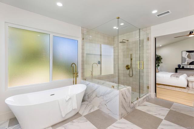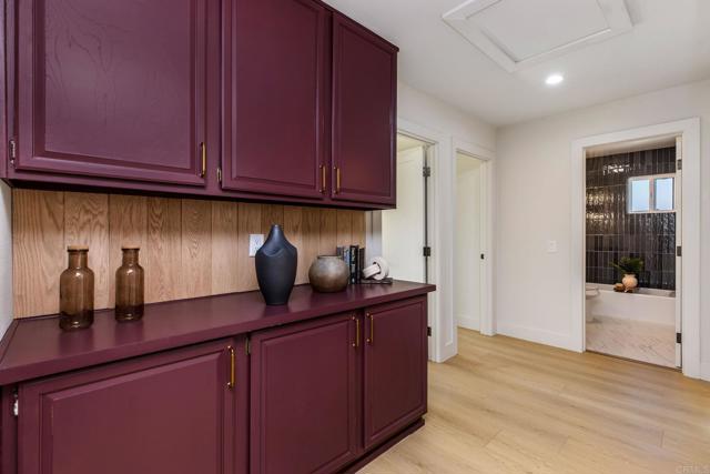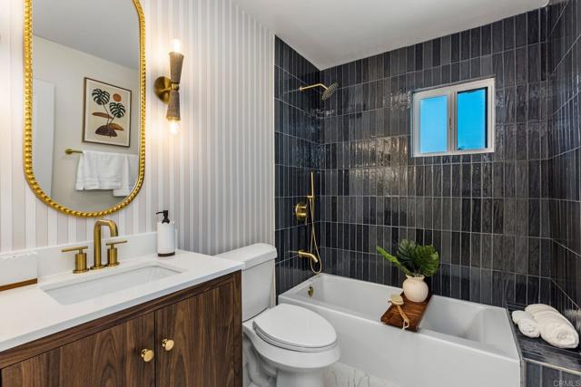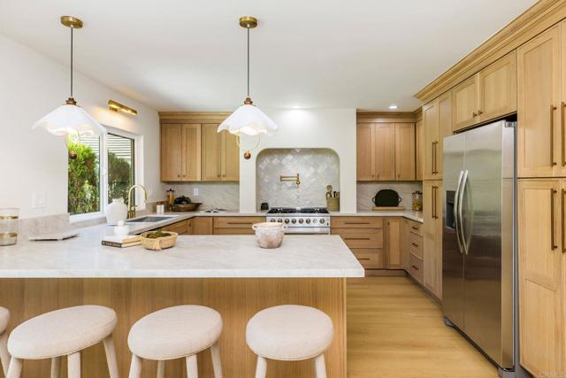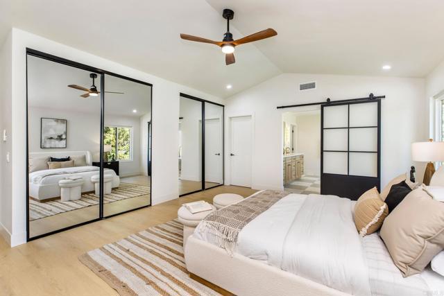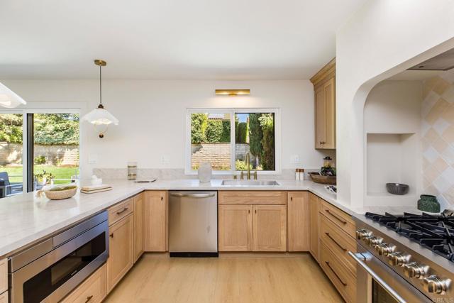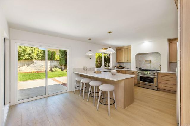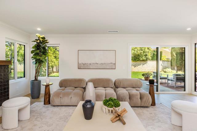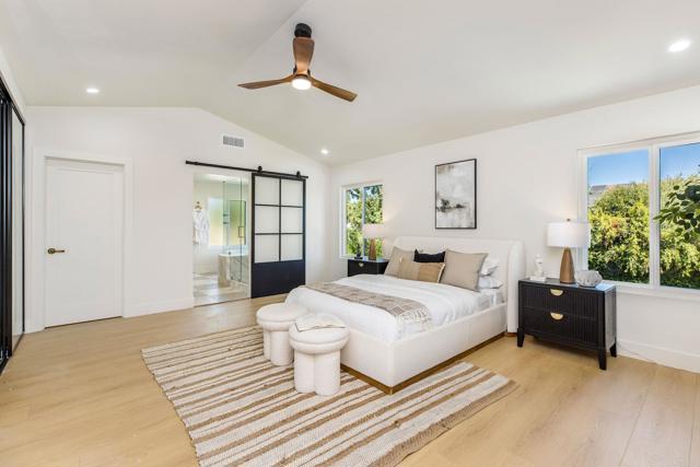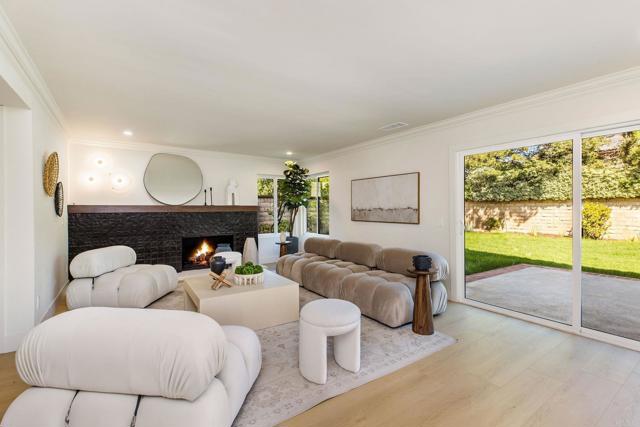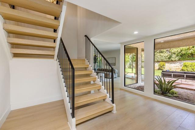 Completely renovated two-story home in the prestigious Morrison Ranch Estates, located on a quiet cul-de-sac in Agoura Hills. This elegant home features warm oak-toned flooring throughout, with a family room that boasts vaulted ceilings, a classic picture window, and a cozy fireplace. A separate dining room connects to the family room, creating a seamless flow for entertaining. Designed with both elegance and function in mind, the kitchen includes white oak cabinetry, creamy stone countertops, an arched range hood with hidden niches, all-new appliances, and gold finishes throughout. The living room makes a statement with black accents, a sleek fireplace, and a built-in dry bar with beverage fridge. A central atrium and a convenient half bathroom complete the main level. Upstairs, your oversized primary suite boasts dual closets and a tranquil, thoughtfully designed bathroom, complete with a freestanding soaking tub, oversized shower with built-in bench, and a dual vanity featuring white oak cabinetry and high-end designer fixtures. Three additional bedrooms upstairs offer generous space, bright natural light, and versatile layouts, ideal for family, guests, or a home office. A fully remodeled hall bathroom features modern finishes and thoughtful design, perfectly complementing the bedrooms and providing comfort for everyday living. The backyard includes a spacious patio and a large grassy lawn, perfect for outdoor dining, play, or gatherings. This home is ideally located near hiking and biking trails, top-rated dining, entertainment, and schools, this home combines modern luxury, thoughtful design, and the best of Agoura Hills living. Experience this Morrison Ranch Estates gem—schedule a private showing today.
