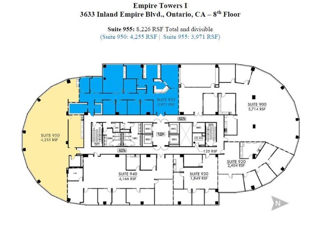 • 9-Story, Class A Office Building • Premiere Ontario Airport Submarket Location • Prominent I-10 Freeway Visibility • Built in 1991; Zoning: SP, City of Ontario • Immediate Access to I-10, at Haven Avenue • Close Proximity to I-15 and 60 Freeways • Reserved Parking Available • Full Service Gross Leases • Professionally Managed and Maintained • Suite 955 has reception area, conference room, 9 private offices, break room and an open area. Suite 955 is divisible (Suite 950: 4,255 RSF & Suite 955: 3,971 RSF).