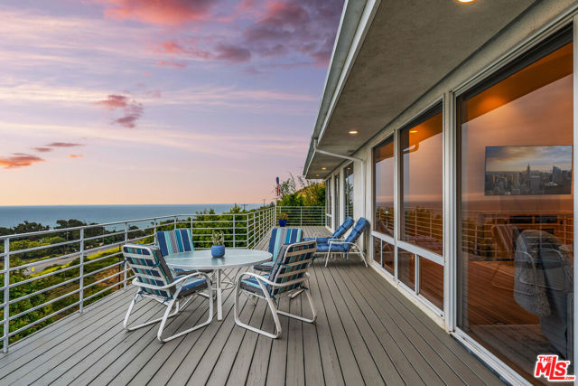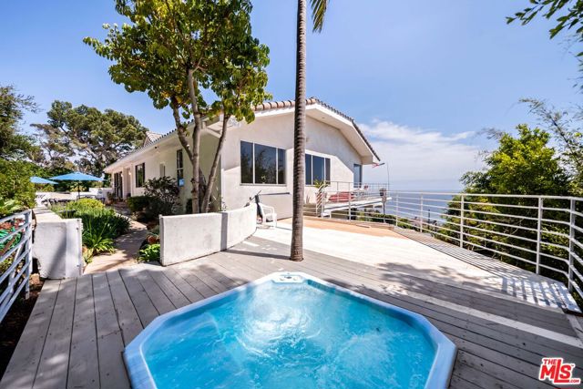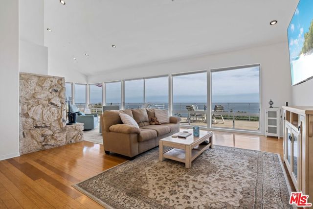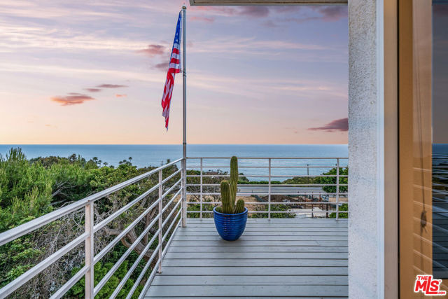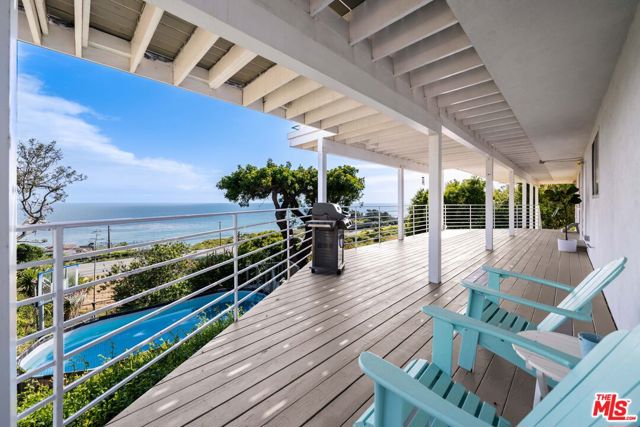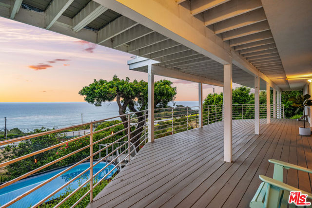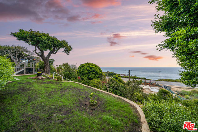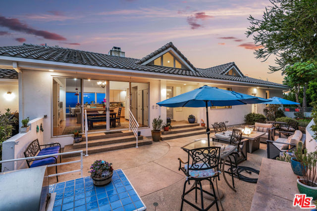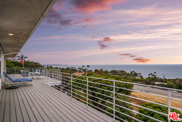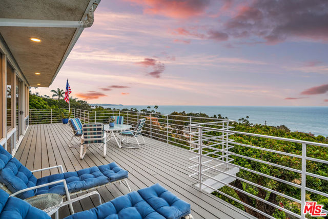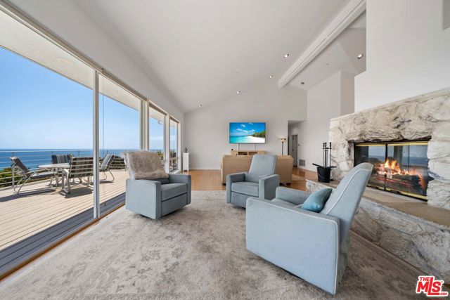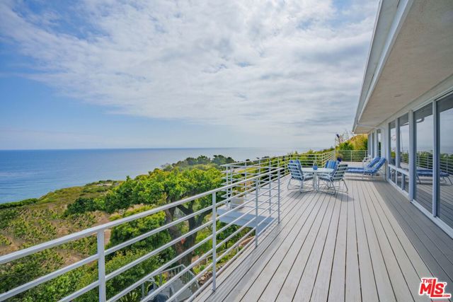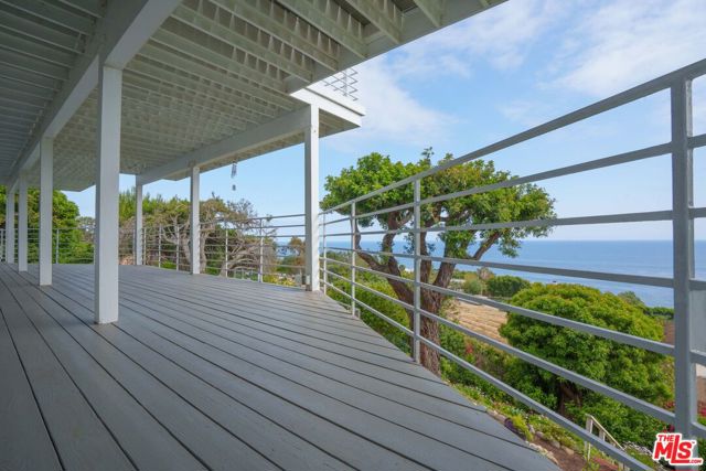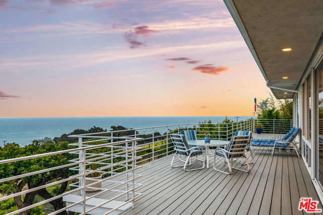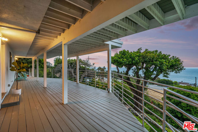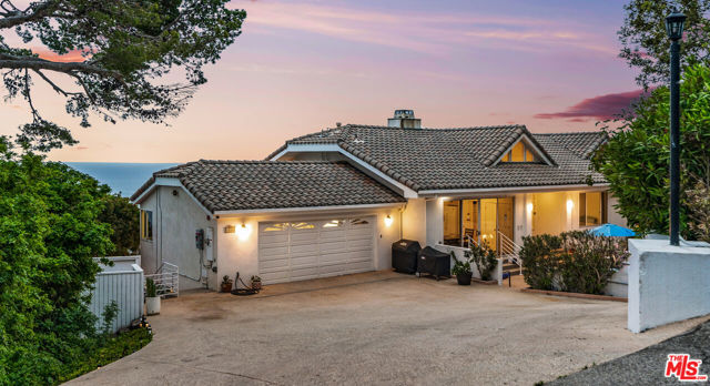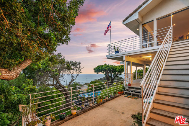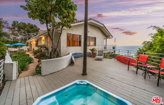 At the bottom of Encinal Canyon Rd, perched opposite La Piedra State Beach on an exclusive cul-de-sac, this early 90’s California Contemporary boasts lofty high beam ceilings and endless walls of expansive floor-to-ceiling sliding glass doors that open to wrap-around decks and patios with built-in jacuzzi for a seamless fusion of indoor and outdoor living. Behold the captivating 180-degree panoramic ocean views stretching majestically from Palos Verdes to Leo Carrillo and Point Dume out to Catalina, Santa Barbara Island, and the Channel Islands, from the early blush of dawn to the fiery embrace of sunset. Experience the awe-inspiring views from a center island granite kitchen opening to the spacious dining & living room complete with a magnificent stone-faced wood-burning fireplace, summoning warmth and sophistication in equal measure. The upper-level features four bedrooms and three bathrooms, while the generous one bed one bath attached guesthouse below offers a private haven opening onto its own large decks and the hedged and terraced grounds below. Outside, indulge in an oasis of tranquility with a built-in barbecue, and lush orchards boasting an abundance of succulent apples, zesty grapefruits, tantalizing tangerines, luscious lemons, and ambrosial loquats. Embrace the epitome of the Malibu lifestyle as this enchanting haven situates you within mere moments Trancas Country Market and the El Matador, La Piedra, El Pescador, and Leo Carrillo beaches, ensuring that every sun-kissed day unfolds with endless possibilities and extraordinary moments in the heart of Malibu’s splendor.