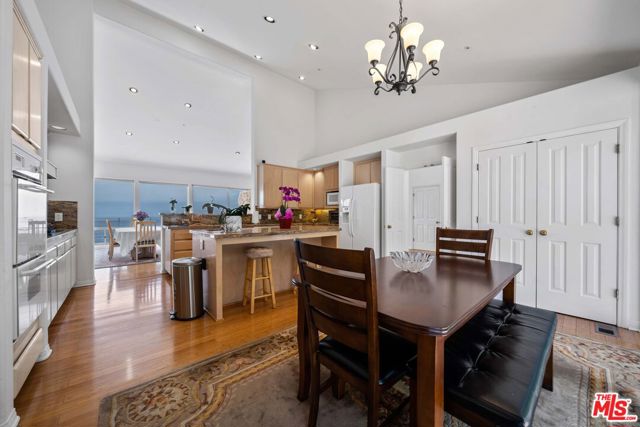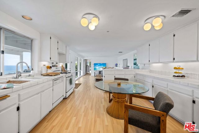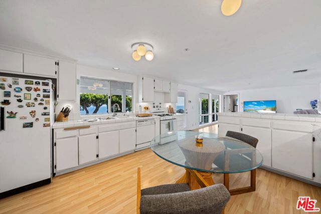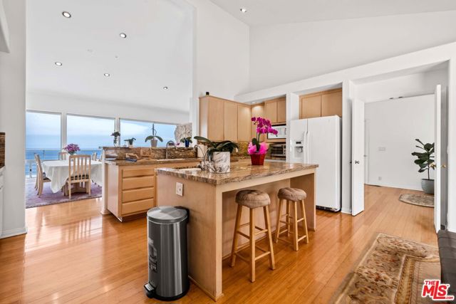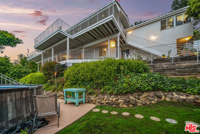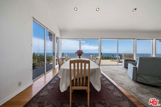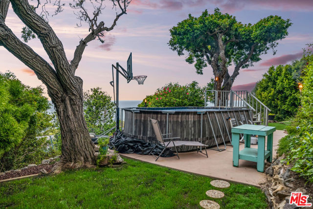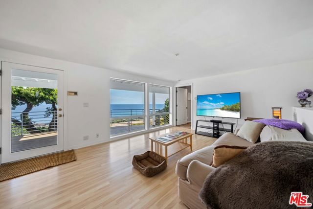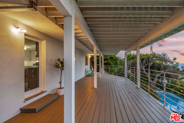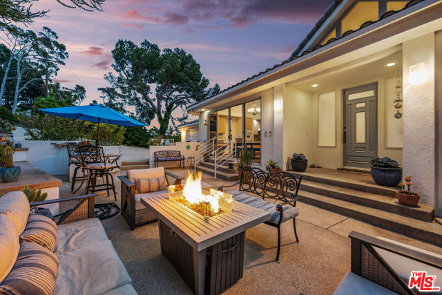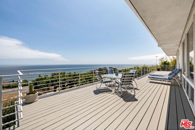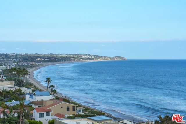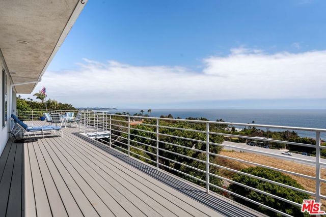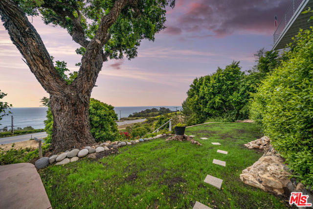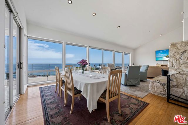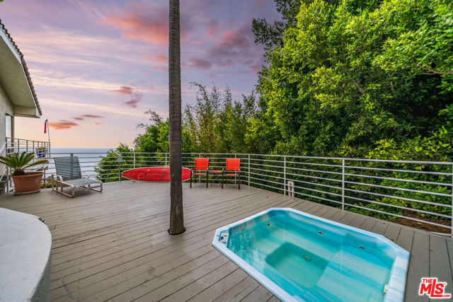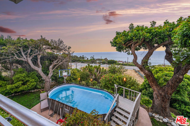 At the bottom of Encinal Canyon Rd, perched opposite La Piedra State Beach on an exclusive cul-de-sac, this early 90’s California Contemporary boasts lofty high beam ceilings and endless walls of expansive floor-to-ceiling sliding glass doors that open to wrap-around decks and patios with built-in jacuzzi for a seamless fusion of indoor and outdoor living. Behold the captivating 180-degree panoramic ocean views stretching majestically from Palos Verdes to Leo Carrillo and Point Dume out to Catalina, Santa Barbara Island, and the Channel Islands, from the early blush of dawn to the fiery embrace of sunset. Experience the awe-inspiring views from a center island granite kitchen opening to the spacious dining & living room complete with a magnificent stone-faced wood-burning fireplace, summoning warmth and sophistication in equal measure. The upper-level features four bedrooms and three bathrooms, while the generous one bed one bath attached guesthouse below offers a private haven opening onto its own large decks and the hedged and terraced grounds below. Outside, indulge in an oasis of tranquility with a built-in barbecue, and lush orchards boasting an abundance of succulent apples, zesty grapefruits, tantalizing tangerines, luscious lemons, and ambrosial loquats. Embrace the epitome of the Malibu lifestyle as this enchanting haven situates you within mere moments Trancas Country Market and the El Matador, La Piedra, El Pescador, and Leo Carrillo beaches, ensuring that every sun-kissed day unfolds with endless possibilities and extraordinary moments in the heart of Malibu’s splendor.