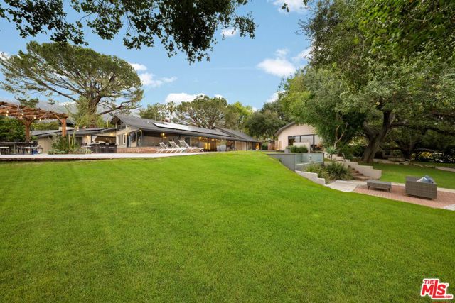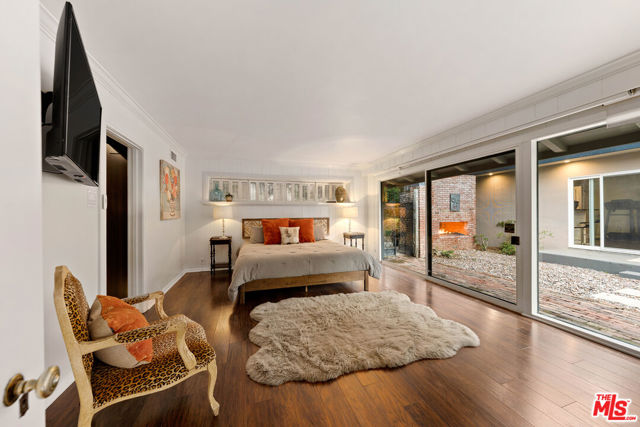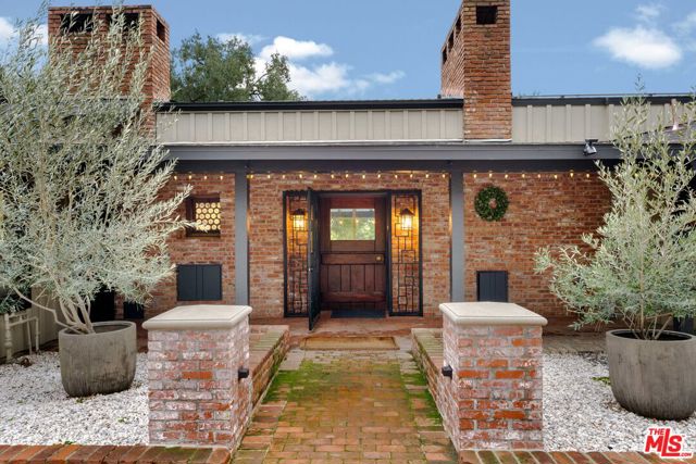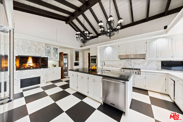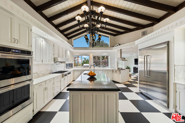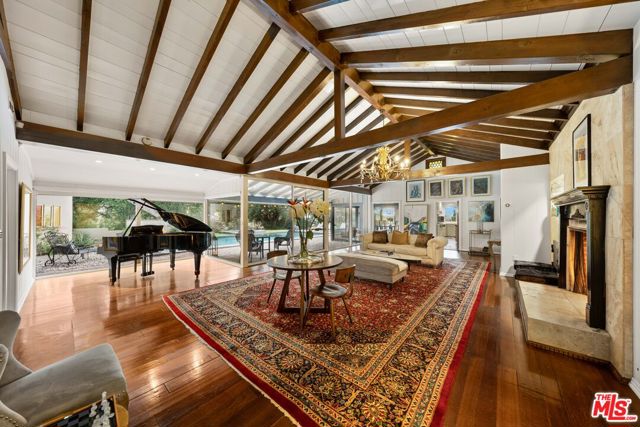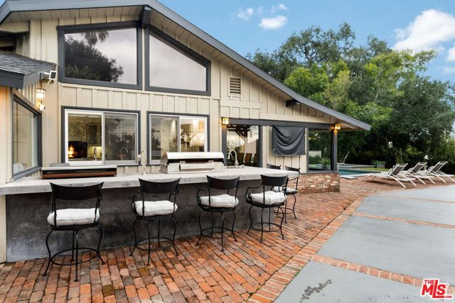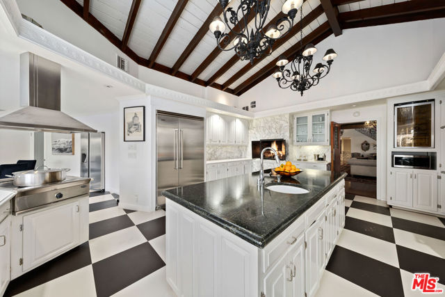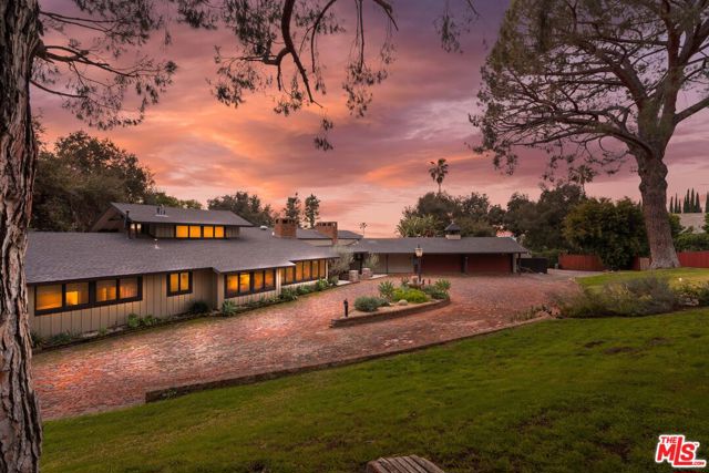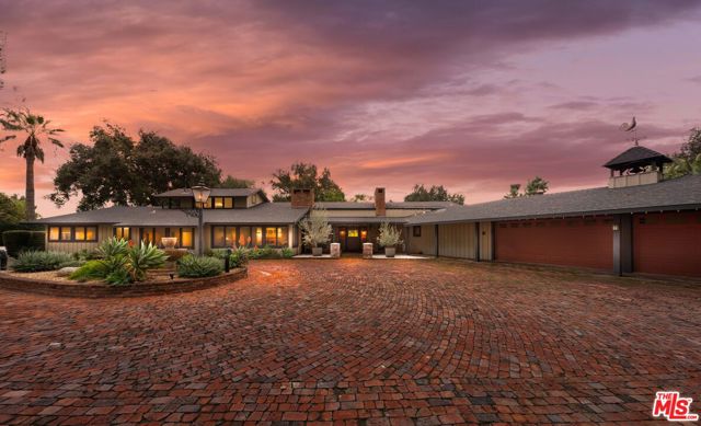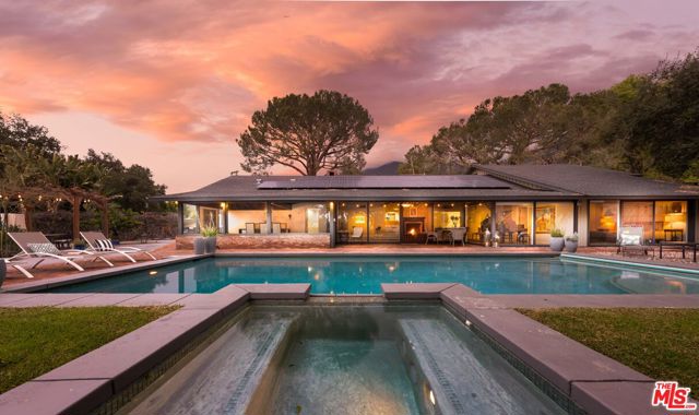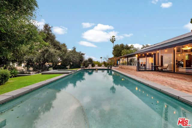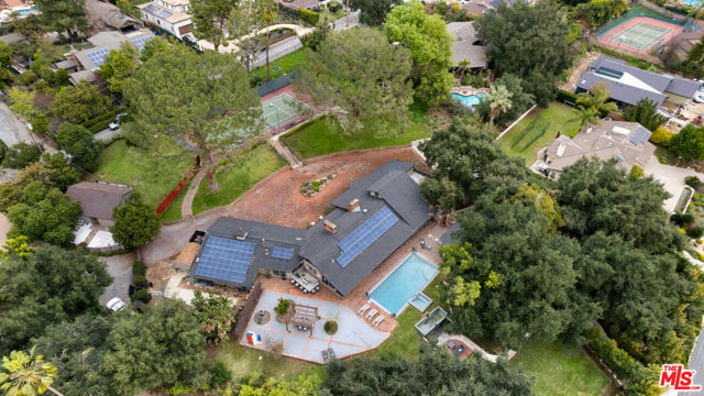 Tennis Court Estate. Nestled on expansive gated grounds spanning over 1.76 acres, this custom-built midcentury ranch estate seamlessly combines the timeless allure of Mid-Century design with the craftsmanship reminiscent of late 1940’s architecture. Passing through a brick circular driveway, you’ll discover this predominantly single-level residence adorned with exquisite architectural elements that pay homage to its era. The entryway, accessed through an iron gate and coke-glass door, welcomes you into the grand formal living room featuring a vaulted wood beamed ceiling, a striking chandelier, and a magnificent, oversized fireplace. Expansive glass doors beckon you to the covered veranda, offering serene views of the pool, spa, and gently rolling grounds. The generously sized remodeled kitchen is a chef’s dream, boasting top-of-the-line Viking appliances, a 42′ gas range, two dishwashers, a built-in wood-burning oven, and a spacious center island adorned with two elegant chandeliers. Additional amenities include a Wok, wine refrigerator, and two refrigerators/freezers. Adjacent to the family room, an outdoor full-sized kitchen awaits, perfect for hosting gatherings, super bowl parties and al fresco dining. The 4,8412 sq. ft main residence comprises four bedrooms, including a newer primary suite and bath featuring a luxurious soaking tub, dual Quartz counters with 2 sinks, and a generously sized walk-in closet. With four baths, a lower-level media room, and an upstairs office, this home provides ample space for both relaxation and privacy. Connected to the main house by an outdoor fireplace, a newer 746 sq. ft 1 bedroom 1 bath pool house awaits, complete with a wet bar, sauna, and an additional bedroom, all equipped with their own HVAC system. A separate 752 sq. ft separate two bedroom two bath guest house is situated towards the rear of the property, offering a private retreat for visitors. Completing the impressive grounds is a regulation-sized tennis court. With the property spanning from street to street, this ultra-private compound presents a truly unique opportunity to own a vast private estate in a tranquil setting that exudes privacy and serenity.