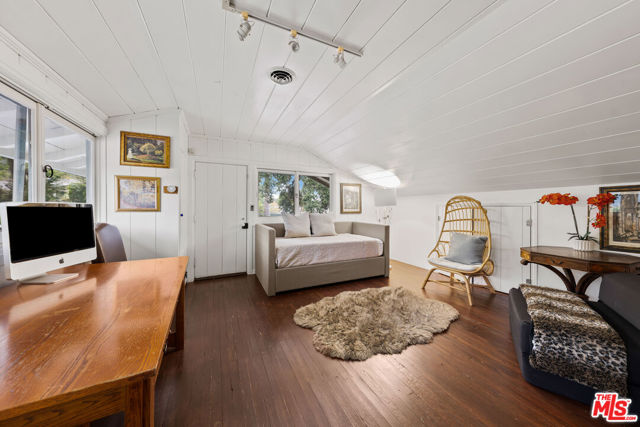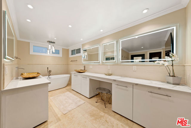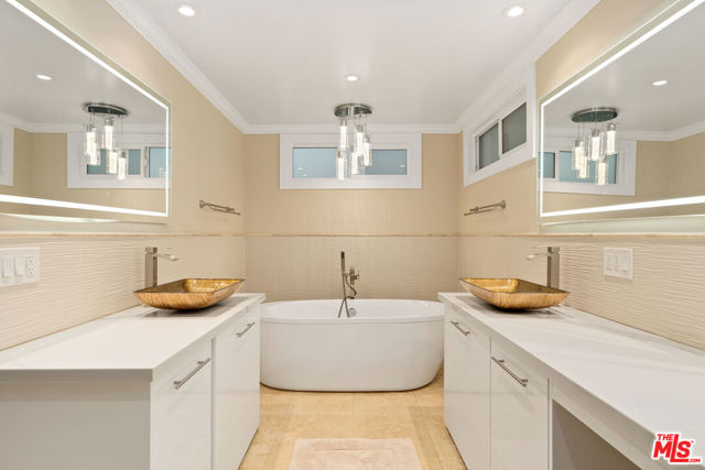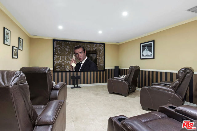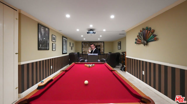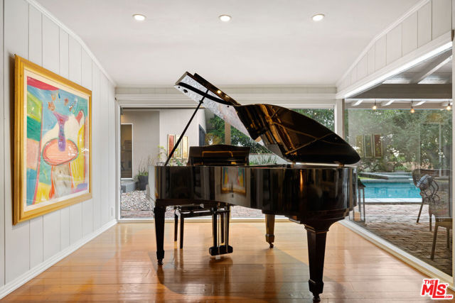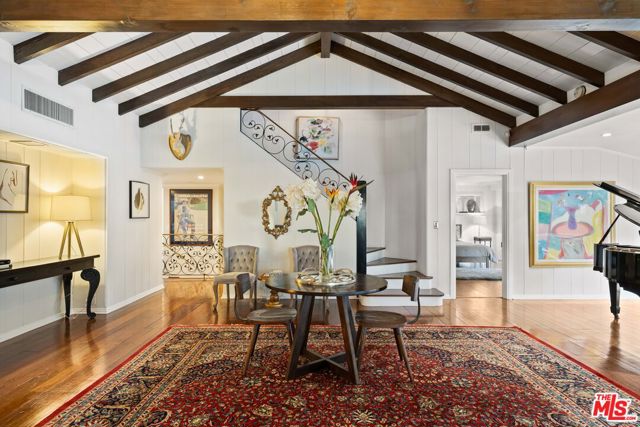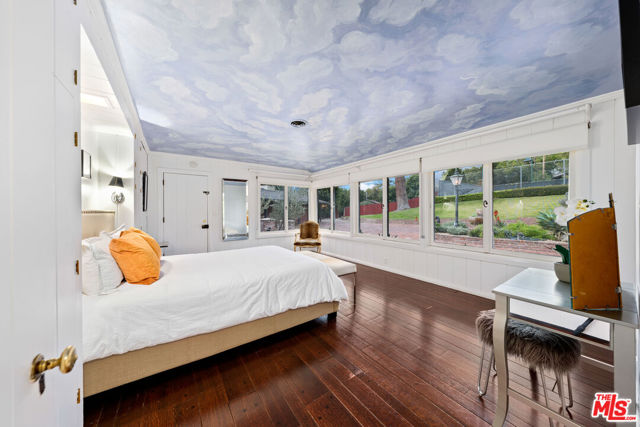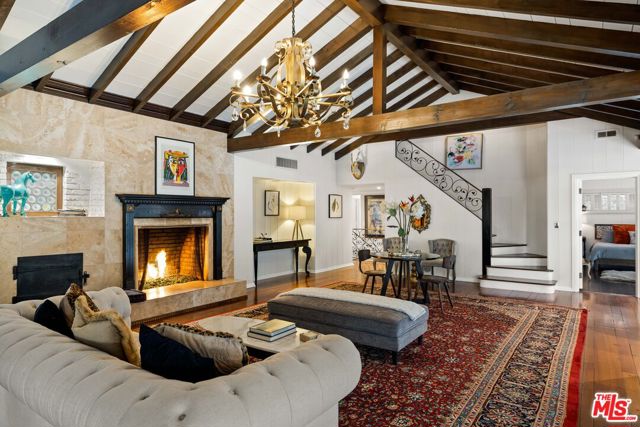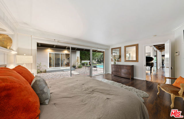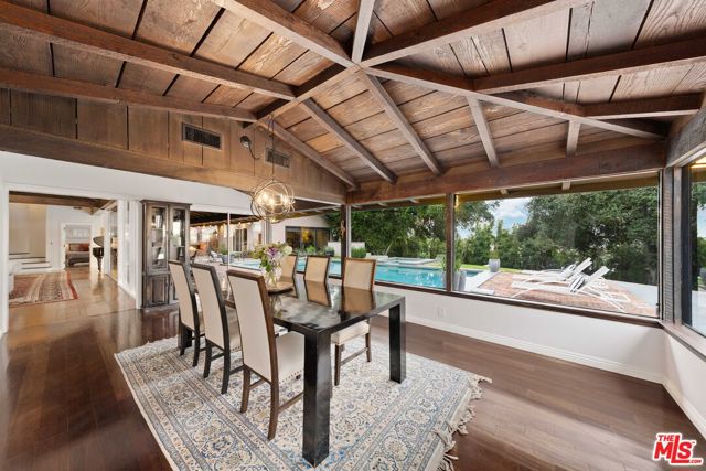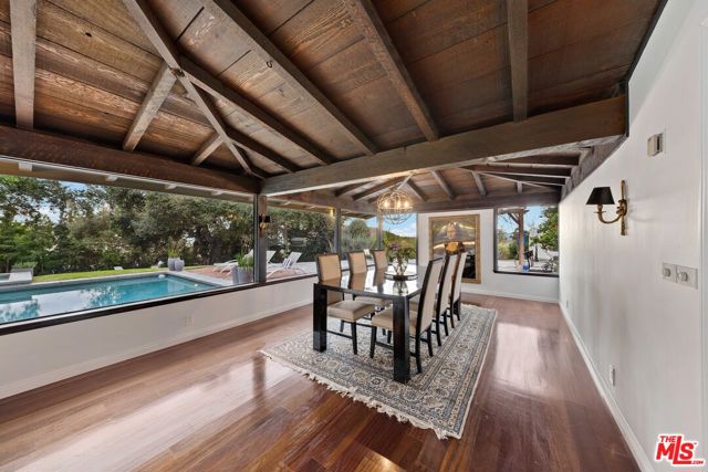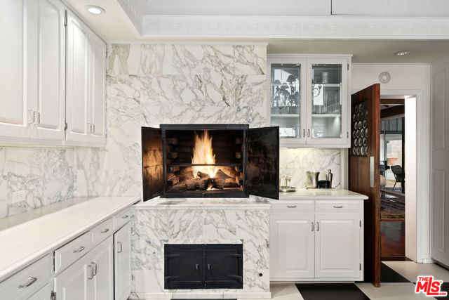 Tennis Court Estate. Nestled on expansive gated grounds spanning over 1.76 acres, this custom-built midcentury ranch estate seamlessly combines the timeless allure of Mid-Century design with the craftsmanship reminiscent of late 1940’s architecture. Passing through a brick circular driveway, you’ll discover this predominantly single-level residence adorned with exquisite architectural elements that pay homage to its era. The entryway, accessed through an iron gate and coke-glass door, welcomes you into the grand formal living room featuring a vaulted wood beamed ceiling, a striking chandelier, and a magnificent, oversized fireplace. Expansive glass doors beckon you to the covered veranda, offering serene views of the pool, spa, and gently rolling grounds. The generously sized remodeled kitchen is a chef’s dream, boasting top-of-the-line Viking appliances, a 42′ gas range, two dishwashers, a built-in wood-burning oven, and a spacious center island adorned with two elegant chandeliers. Additional amenities include a Wok, wine refrigerator, and two refrigerators/freezers. Adjacent to the family room, an outdoor full-sized kitchen awaits, perfect for hosting gatherings, super bowl parties and al fresco dining. The 4,8412 sq. ft main residence comprises four bedrooms, including a newer primary suite and bath featuring a luxurious soaking tub, dual Quartz counters with 2 sinks, and a generously sized walk-in closet. With four baths, a lower-level media room, and an upstairs office, this home provides ample space for both relaxation and privacy. Connected to the main house by an outdoor fireplace, a newer 746 sq. ft 1 bedroom 1 bath pool house awaits, complete with a wet bar, sauna, and an additional bedroom, all equipped with their own HVAC system. A separate 752 sq. ft separate two bedroom two bath guest house is situated towards the rear of the property, offering a private retreat for visitors. Completing the impressive grounds is a regulation-sized tennis court. With the property spanning from street to street, this ultra-private compound presents a truly unique opportunity to own a vast private estate in a tranquil setting that exudes privacy and serenity.