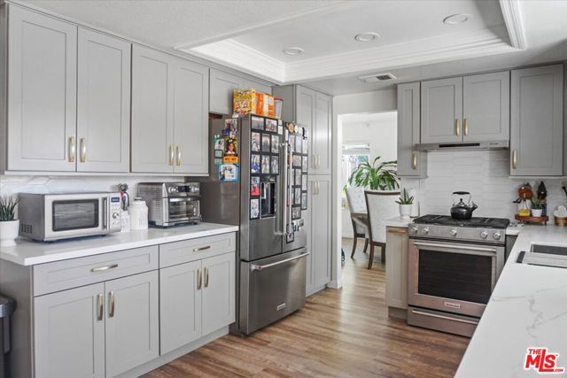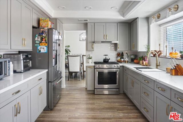 Come see this renovated 3bed 3 bath Single Family Residence. Level one consists of a living room, formal dinning, family room with fireplace, kitchen and a 4th ensuite bonus room with private entrance. The second level consists of a master ensuite, and additional bedrooms /baths. 2 Car garage, laundry room, and a large backyard complete this home. The house has recently gone through an extensive renovation including but not limited to: custom kitchen cabinets, beautiful quartz countertops, stainless steel appliances, all new flooring, lighting, vanities, fixtures, doors, windows, landscaping, exterior paint, New roof, and HVAC system. Security system also installed throughout the house.