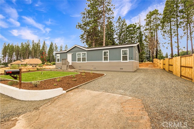 Brand new manufactured home in a peaceful, tranquil setting on the East side of Paradise! Seller is offering a $22,000 incentive towards a rate buy down, closing costs or desired improvements!! This 1296 sqft home offers 2 bedrooms, 2 baths plus an office on .33 of an acre with immaculate landscaping, a lemon tree and so much curb appeal! It has an open floor plan with so much natural light, views of trees and even the hills of the Feather River Canyon out your front windows. You’ll love the island in the kitchen that includes a 5 burner gas range and matching appliances along with a large walk-in pantry. Additional features include an extra spacious laundry room with a utility sink, space for storage or even a freezer, smart Ecobee thermostat, ample storage with linen, coat and closets galore…plus walk-in closets in both bedrooms. The primary suite is spacious with a huge en suite bathroom and also includes ample storage space. This energy efficient home has R33 insulation in the attic space, R22 in the floors and R11 insulation in the floors for superior energy efficiency, it also comes with a 12 month factory warranty good though July 2024 along with an additional 3 year structural (not cosmetic) warranty for a total of 4 years of coverage. Don’t miss this lovely, brand new home tucked away at the end of a secluded, quiet lane close to Feather River Canyon and hiking distance from the flumes!
