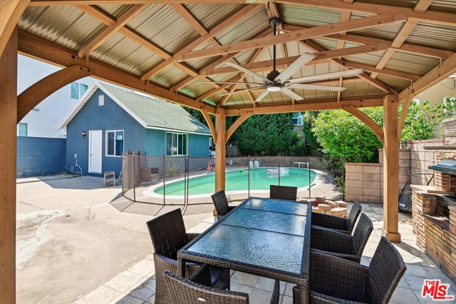 Beautifully Upgraded 5-Bedroom Pool Home w/ ADU in Highly-Desirable Melrose Hills Neighborhood! Having undergone recent renovations, this stunner features designer finishes throughout & is move-in ready. Open modern-concept layout w/ hardwood flooring, crown mouldings, & ceiling fans throughout. Living room w/ brick fireplace & built-in surround-sound system. Adjacent dining area w/ sliding patio doors for al-fresco dining. Chef’s kitchen w/ shaker cabinets, quartz countertops, high-end stainless-steel appliances, & dine-in bar. Upgraded bathrooms w/ designer marble-top vanities. ADU studio unit features full bathroom/kitchen & mini-split HVAC system. Spacious backyard w/ swimming pool, built-in BBQ/outdoor kitchen area, firepit, & gazebo – perfect for entertaining! Other upgrades include copper plumbing & 200-amp electrical panel. Fully gated lot. Laundry room. Central AC + Heat. Storage shed. Plenty of driveway parking. R2 Zoning provides possible future development opportunities. Just minutes to Wilshire Country Club & the best shopping, dining, & entertainment the area has to offer. Turnkey!