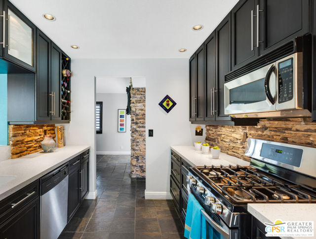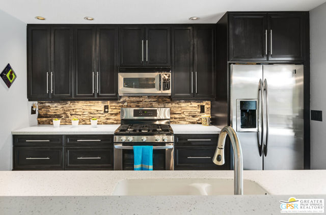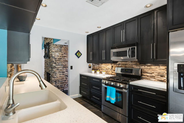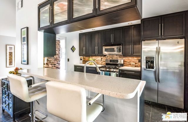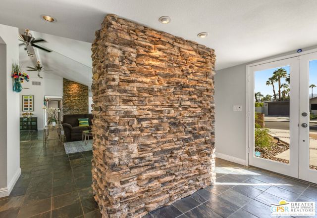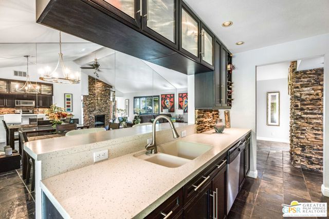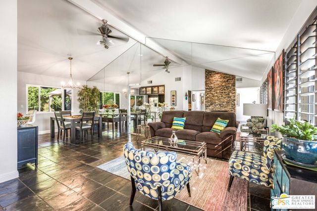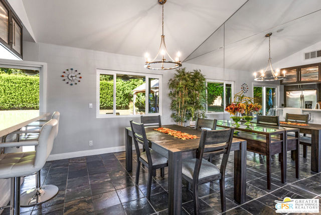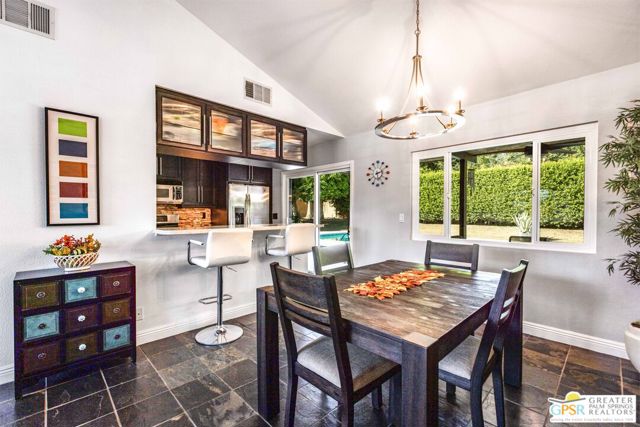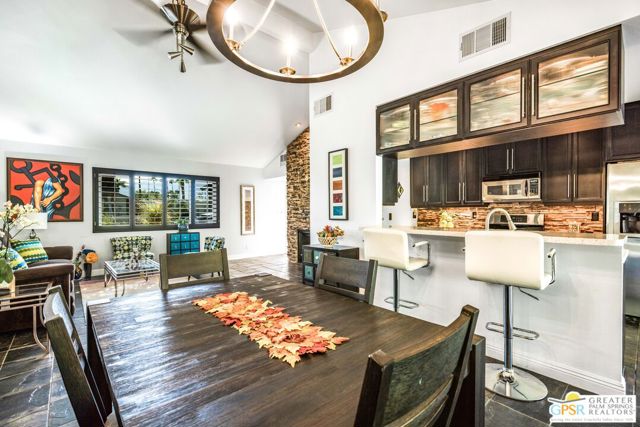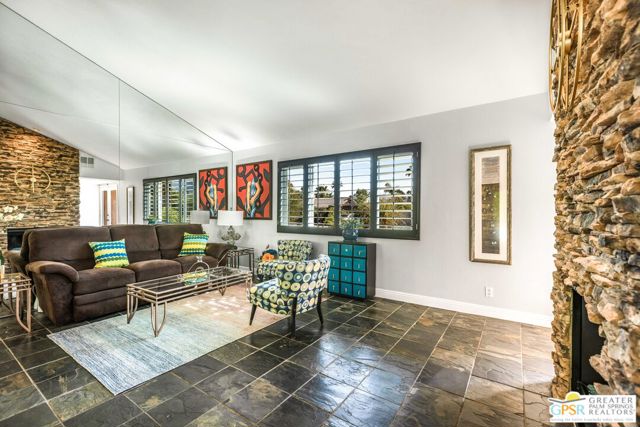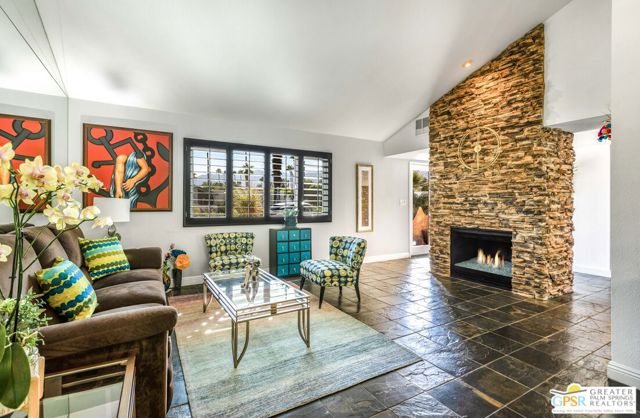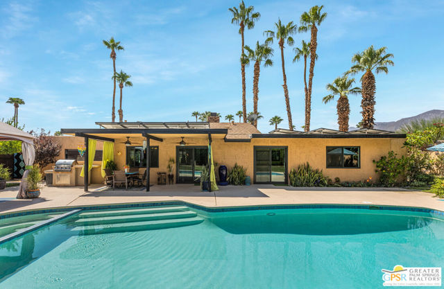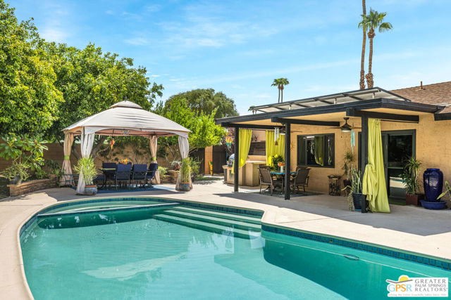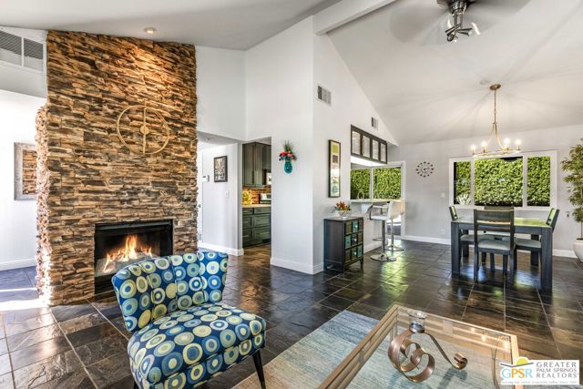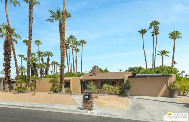 2198 Calle Conejara. PRICE REDUCTION! A home that is intimate and inviting with warm colors, stone surfaces and a welcoming feel that you have arrived home. This 3BD,2BA home is in excellent condition and offers an open floor plan and a cathedral ceiling in the living/dining area, a sophisticated galley kitchen and newer double pane windows and doors throughout. There is great curb appeal up front with an attractive desertscape, a stack stone fireplace and a two-car garage. There is a large salt water pool/spa in the backyard with a covered patio area with beautiful mature landscaping, fruit trees, expansive mountain views, a separate built-in BBQ and an additional gazebo. The yard itself is large with beautiful mature landscaping, fruit trees, and an expansive mountain view with no telephone wires. The land lease has been fully extended to 2066. The lease on the solar system is only $168 per month and is transferable. Calle Conejara is located in central Palm Springs on a quiet cul de sac and has easy access to all the many amenities that downtown Palm Springs has to offer.
