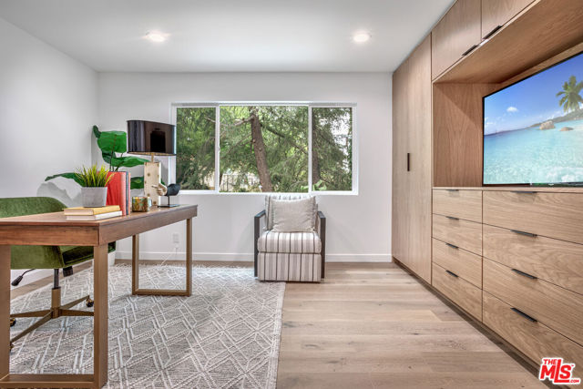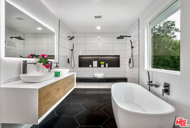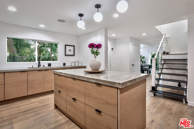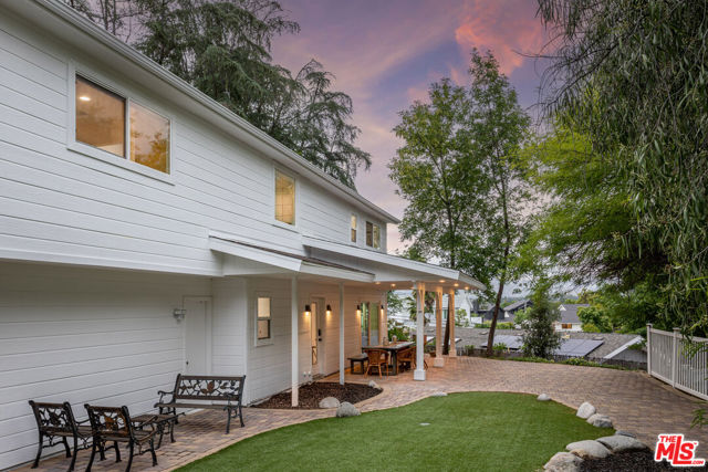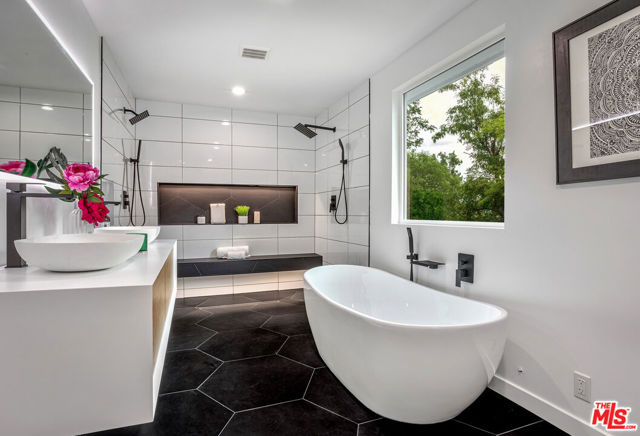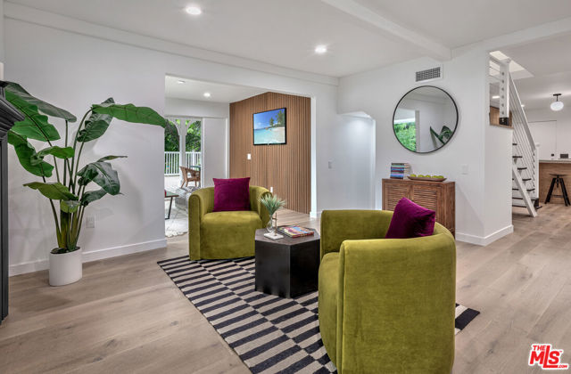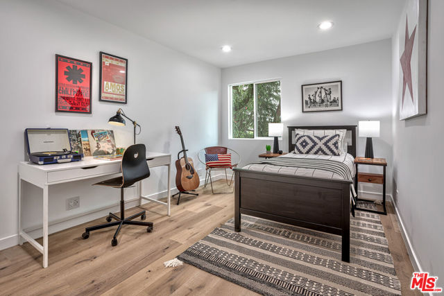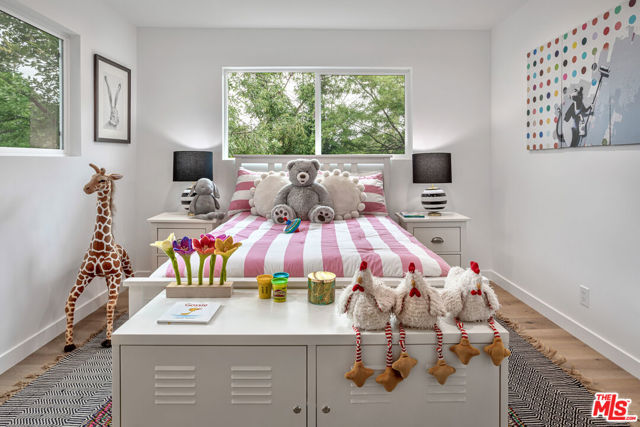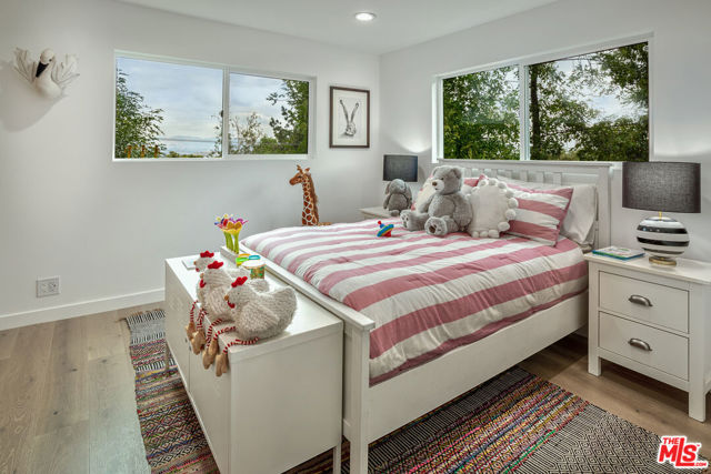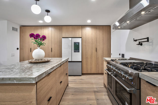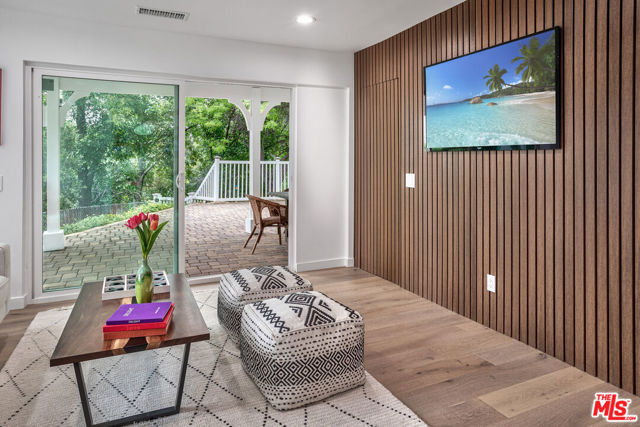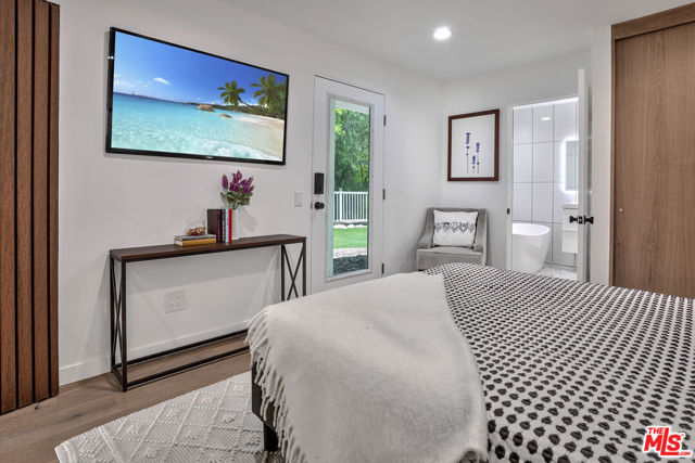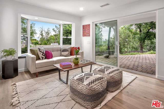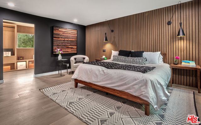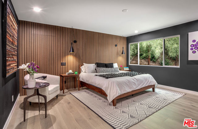 Welcome to your luxurious and custom-reimagined dream home in the exclusive Walnut Acres neighborhood of Woodland Hills. Built and designed by the highly sought after Mid-Century Modern designer Gregory Storm, comes his newest project, this stunning 5 bedroom, 4 bathroom home is set back on a private lot, offering breathtaking views and plenty of space to entertain. As you step inside, you’ll immediately be impressed by the high-end finishes and custom designs throughout. The open and airy floor plan features over 2,559 square feet of living space, making it the perfect place to call home. The chef’s kitchen is a true masterpiece, boasting top-of-the-line appliances, custom cabinetry, and beautiful Scandinavian style concrete countertops. The spacious living room and dining room are perfect for entertaining guests or relaxing with loved ones. The primary bedroom is a true oasis, complete with a luxurious en-suite bathroom, massive walk-in custom oak closet and stunning views of the surrounding landscape. Each of the additional 3 upstairs bedrooms are spacious and bright, with plenty of room for a growing family or guests. Downstairs, you will find the hidden 5th bedroom suite with en-suite custom bath and access to the backyard. The outdoor space is just as impressive, featuring a large and private lot with plenty of room to entertain and relax. Smart home features, including voice-controlled smart lighting, in-ceiling audio system, and 4k security camera system, make this home not only beautiful but also functional. Don’t miss out on the opportunity to own this incredible home in one of Woodland Hills’ most coveted neighborhoods, Walnut Acres.