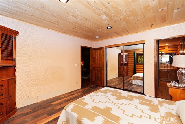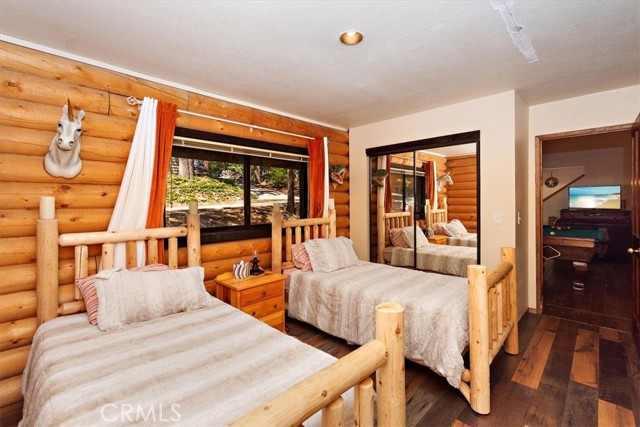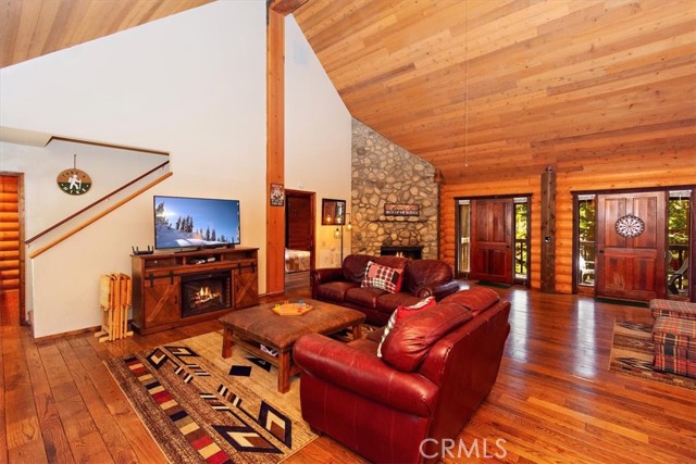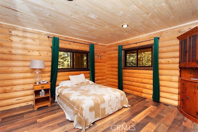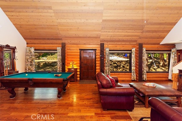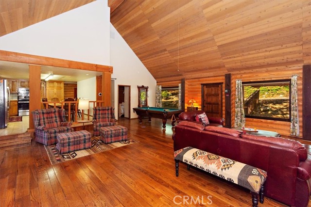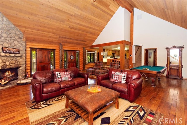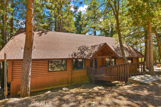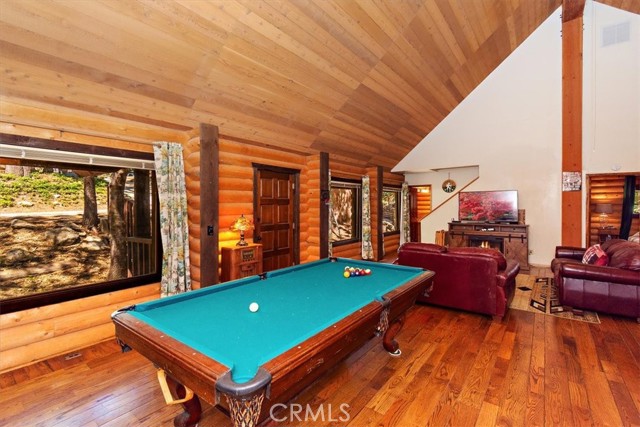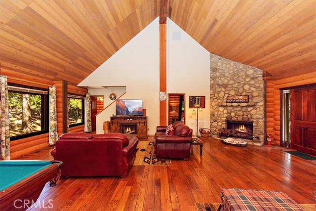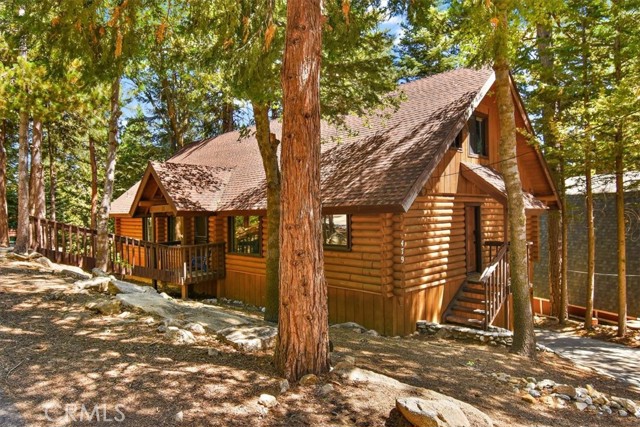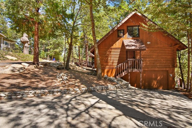 Charming log home nestled in a tranquil neighborhood between Lake Arrowhead and Lake Gregory. Experience the allure of a Great Lodge atmosphere with soaring vaulted ceilings, rich hardwood floors, and a striking rock fireplace that welcomes you. The spacious country kitchen is a chef’s delight, and the main level boasts an inviting owner’s suite. Entertain with ease, thanks to the included pool table and some furnishings. Step outside to your private deck, perfect for barbecuing and enjoying the fresh mountain air. With a one-car garage and ample off street parking, convenience meets comfort. Enjoy modern comforts with nearly new forced air natural gas heating and gas snowblower. Your dream log home awaits!