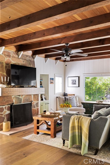 Feel the magic at this charming Lake Arrowhead cottage. Situated on a double lot, expansive and lush with canopied trees and a guest unit, garage and studio, and just a light stroll to the lake. This vintage cabin, circa 1940, offers abundant possibilities for dream mountain living throughout each of the four seasons. The character-rich main living space is full of natural light & original details complimented by immense and impeccable upgrades. The main floor features a serene, beamed ceiling main living space centered around a stone fireplace and flanked by a picture window to take in the idyllic view of the Dogwoods and other native trees. A dining space with French doors opens to the expansive and upgraded deck nested in the trees and finished with a private spa. A chef’s kitchen with custom cabinetry, instant hot and purified water and luxury appliances rounds out the space that is perfect for gathering. The main floor also features a cozy bedroom and spa like bath. Retreat upstairs to one of the two charming, pitched roof bedrooms, each with its’ own tree top views and situated adjacent to the 2nd updated bath and large walk-in closet. Each corner of this home provides a cozy yet clean feel and is the perfect retreat. Wander through the trees to the detached guest unit that includes a large living a sleeping space, a new kitchenette & bath. A private patio and access to the laundry room make this space perfect for guests or income. The freshly landscaped backyard is full of natural plants, fruit trees, a hammock to lounge, mature foliage & special moments, making it feel like you are in a secret garden. Adjacent to the home is a large two car garage that sits atop an unfinished nearly 400 square ft space with boundless opportunities. Fireworks from the deck, glimmers of the lake, leaves changing in the fall and the proximity to nearby Sky Forest, Cedar Glen and Lake Arrowhead Village are all details that make this already desirable home irresistible. Lake rights and abundant parking add an ease of use. This home is a special piece of mountain history!